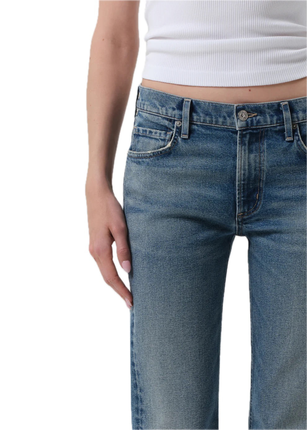 The Genova is a low-rise bootcut silhouette designed to elongate and flatter. Crafted from Japanese comfort stretch denim with a soft, broken-in hand, it offers structure with subtle flexibility. The Clairo wash—a medium indigo with gentle fading and whiskering—adds a timeless, lived-in finish. The versatile full-length leg pairs effortlessly with any kind of shoe—from boots to sneakers to heels.