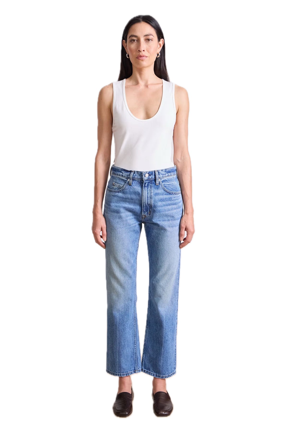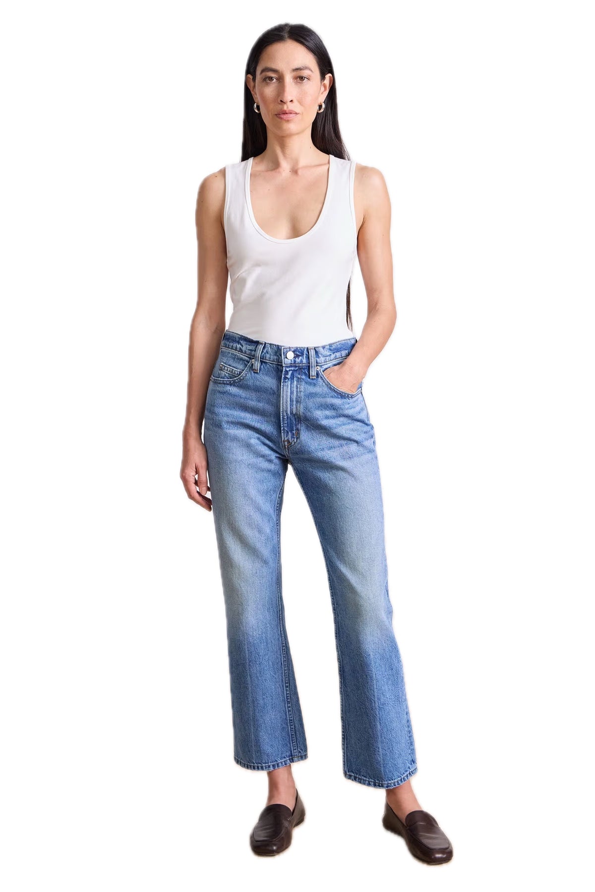 - Mid rise, ankle length, cropped kick flare, belt loops
