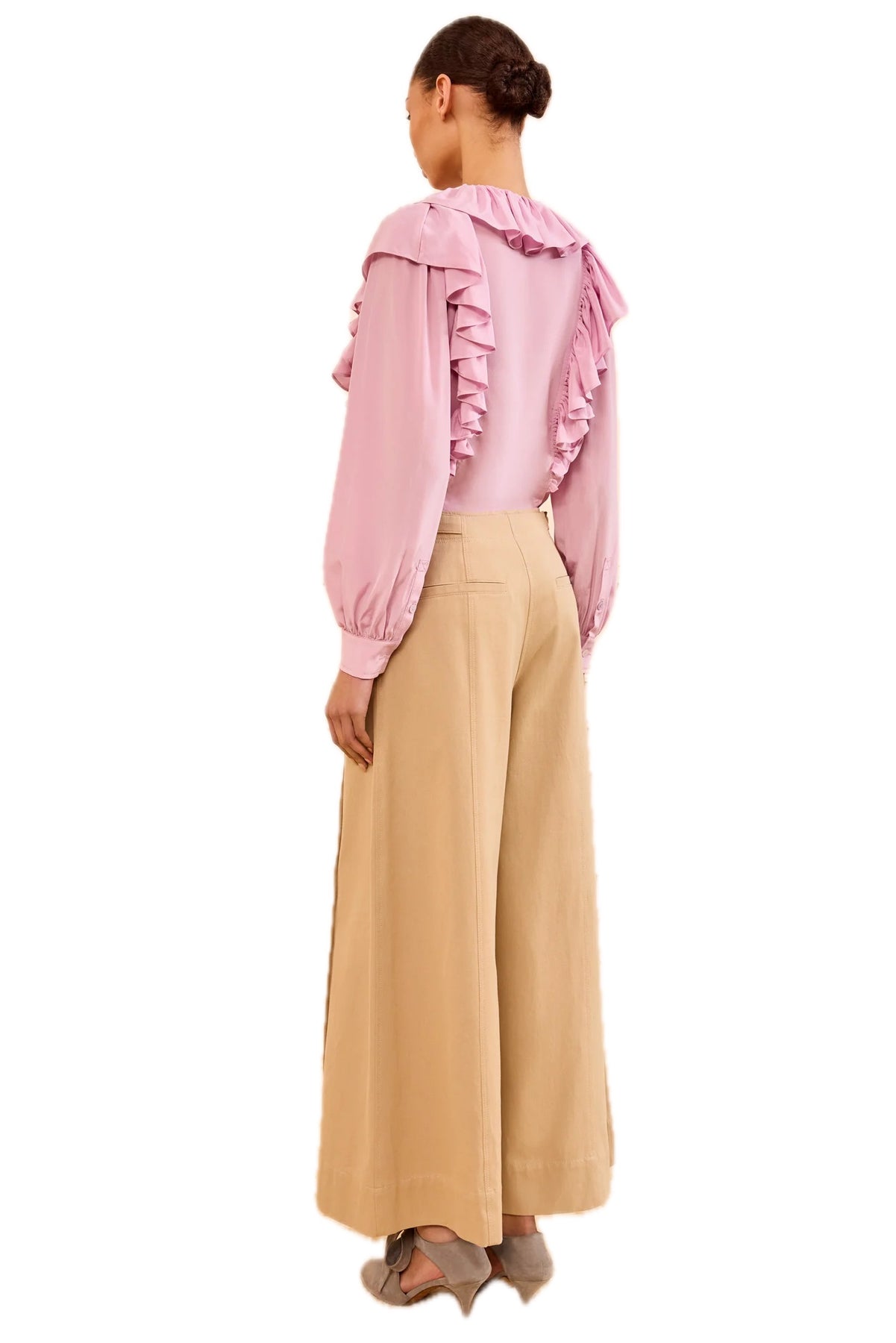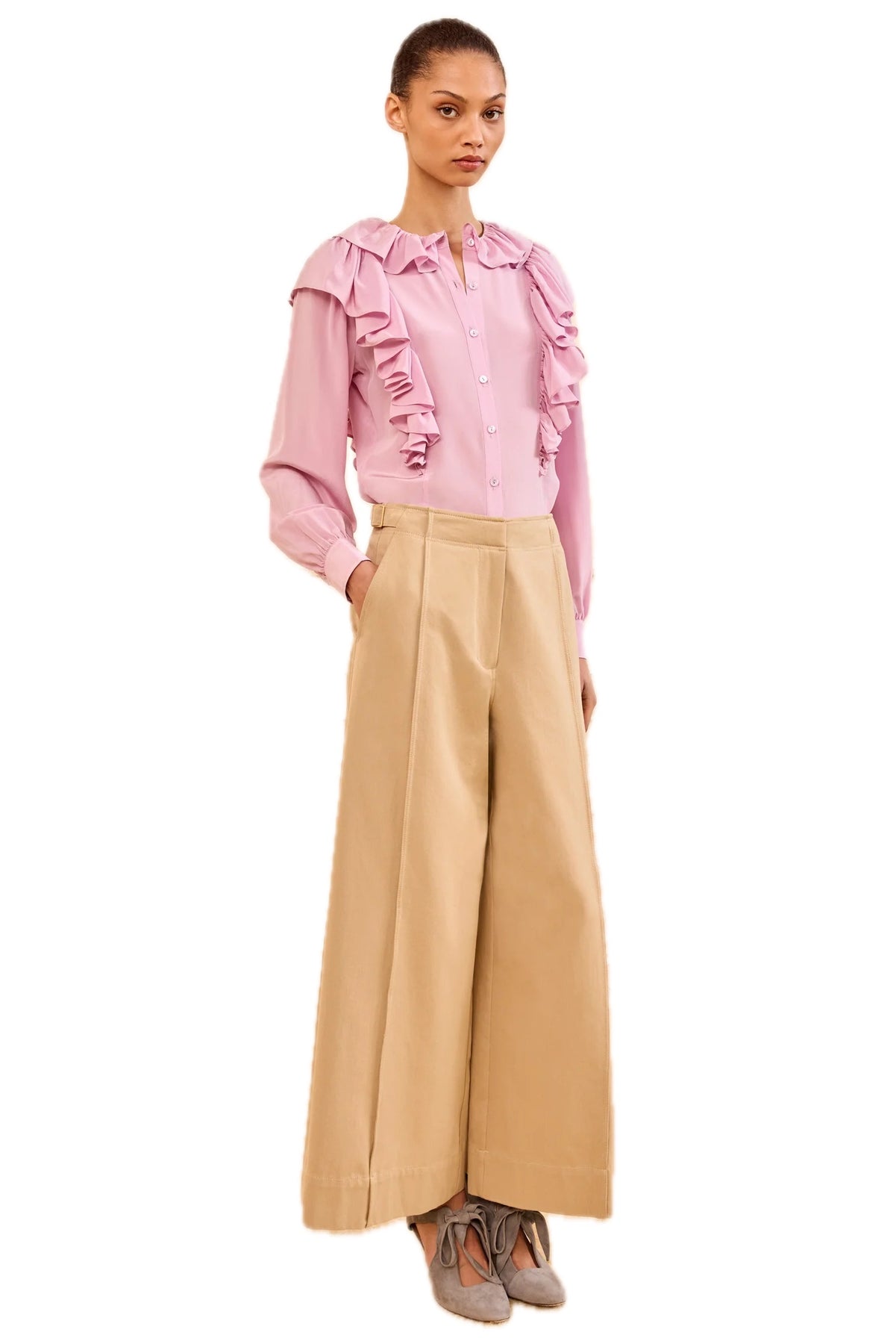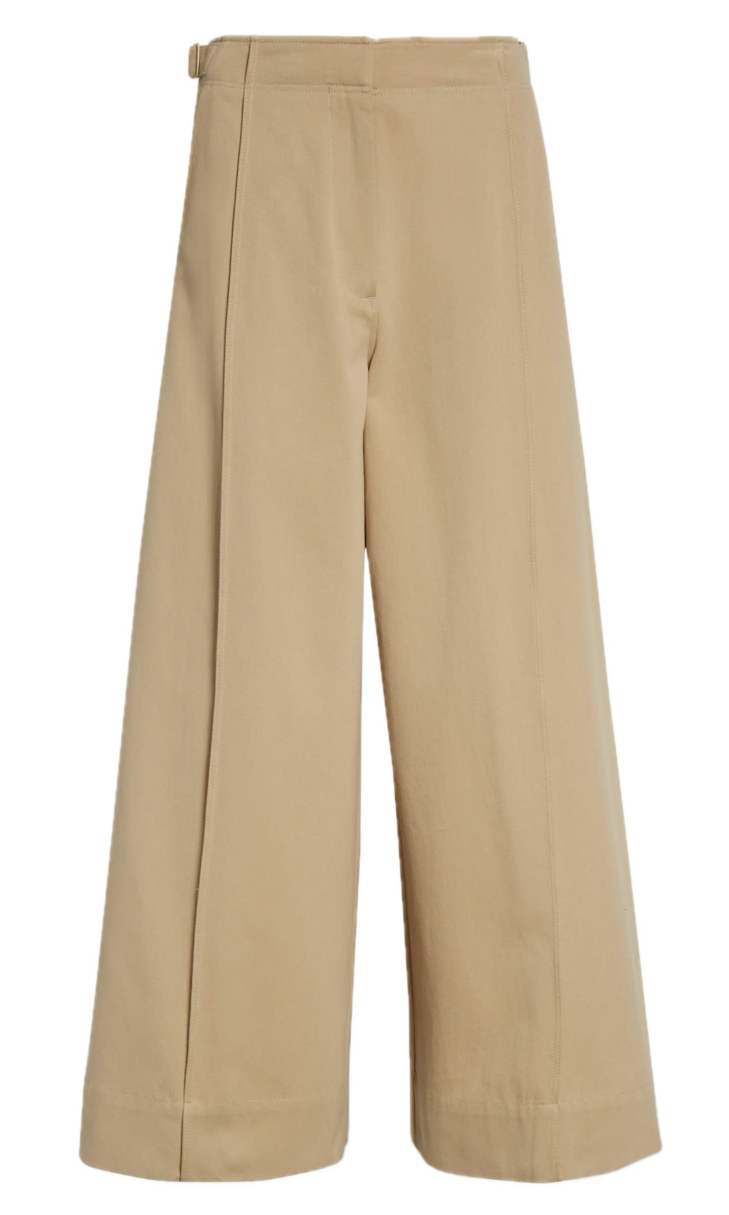 The Sascha Trouser is defined by elegant volume, tailored from khaki twill with fluid, cropped wide legs. The sharp pintucks lend soft structure, while the side buckles add a utilitarian touch.