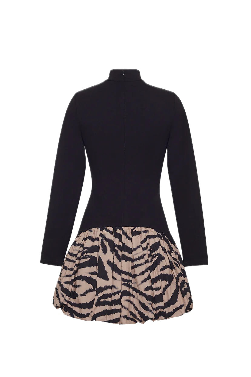 The Issa Dress pairs a sleek black ponte mock neck bodice with a voluminous zebra-print bubble skirt in crisp cotton poplin. Slim sleeves and functional side pockets add ease and edge, while a back invisible zipper ensures a clean finish. Lined at the skirt, unlined through the bodice for lightweight structure.