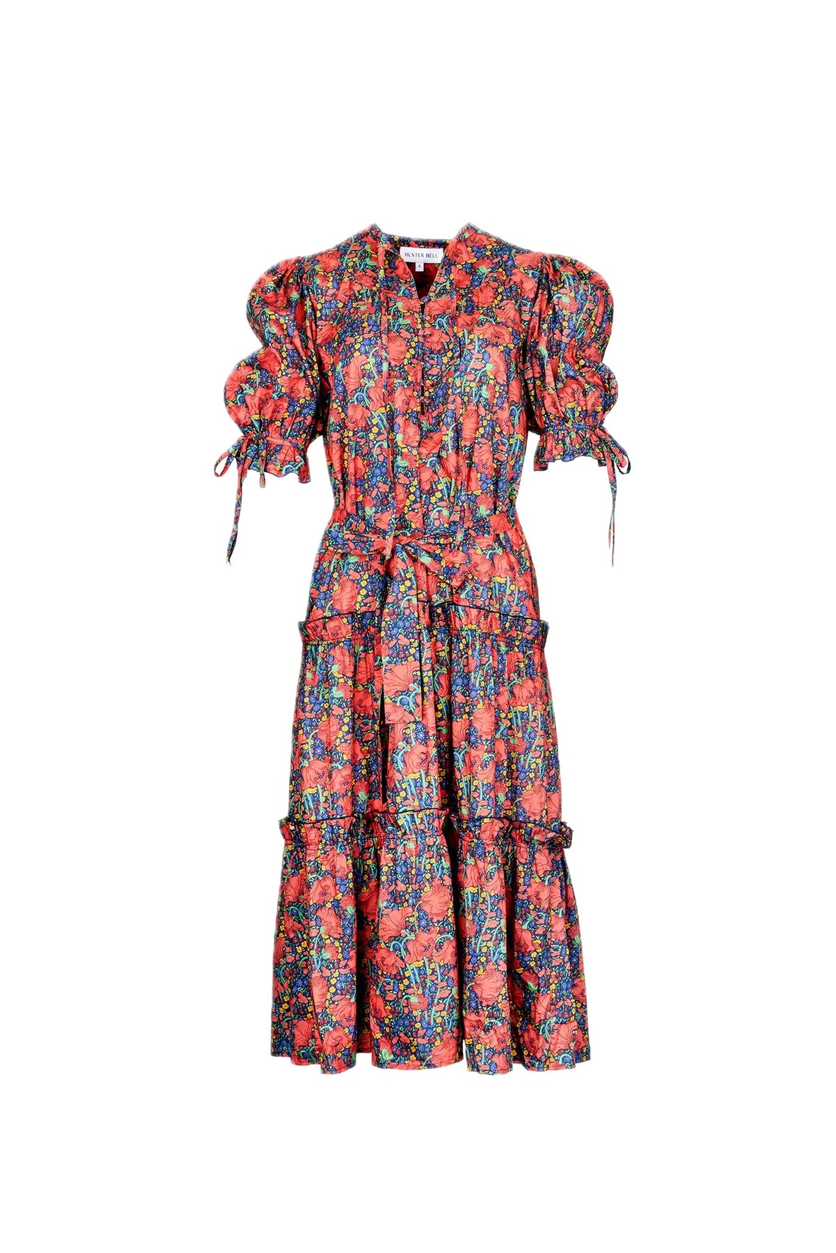 One of Hunter Bell's favorite silhouettes, now Made with Liberty Fabric. The Holloway Dress returns in the charming Clementina Daisy print, bringing fresh romance to a beloved style. An open v-neckline finished with a tie detail and soft gathering from the yoke and button placket add a feminine touch. Elbow-length puff sleeves with adjustable ties and tiered ruffled seams create graceful movement, while an optional sash allows for versatile styling. With its effortless pull-over design, Holloway is destined to be your go-to dress for the holiday season.