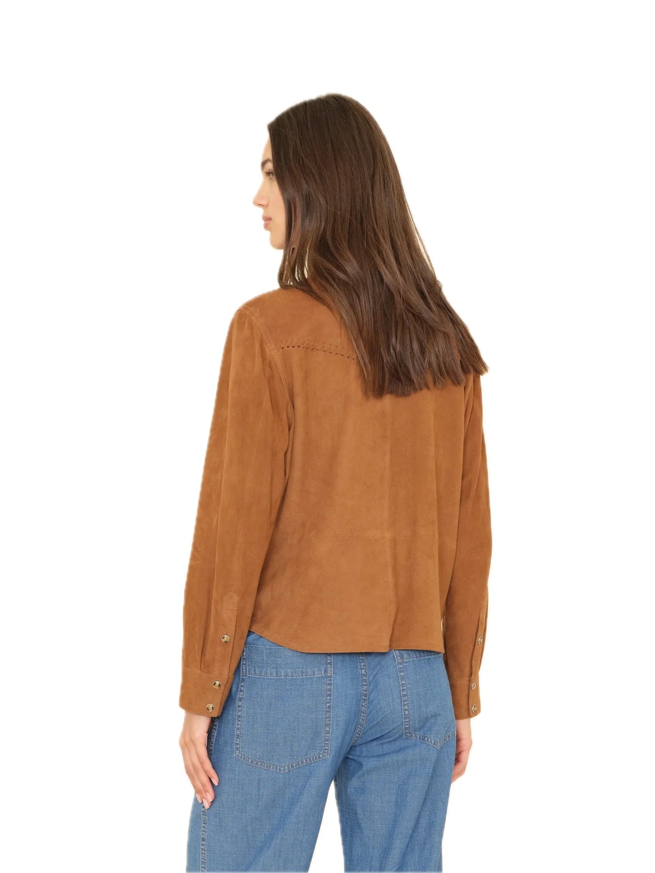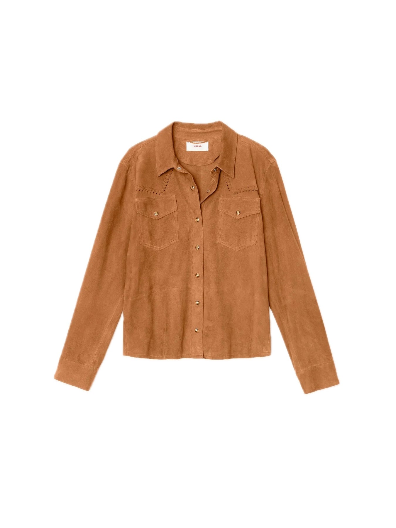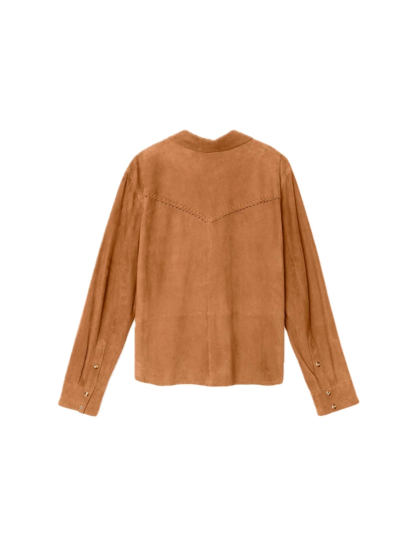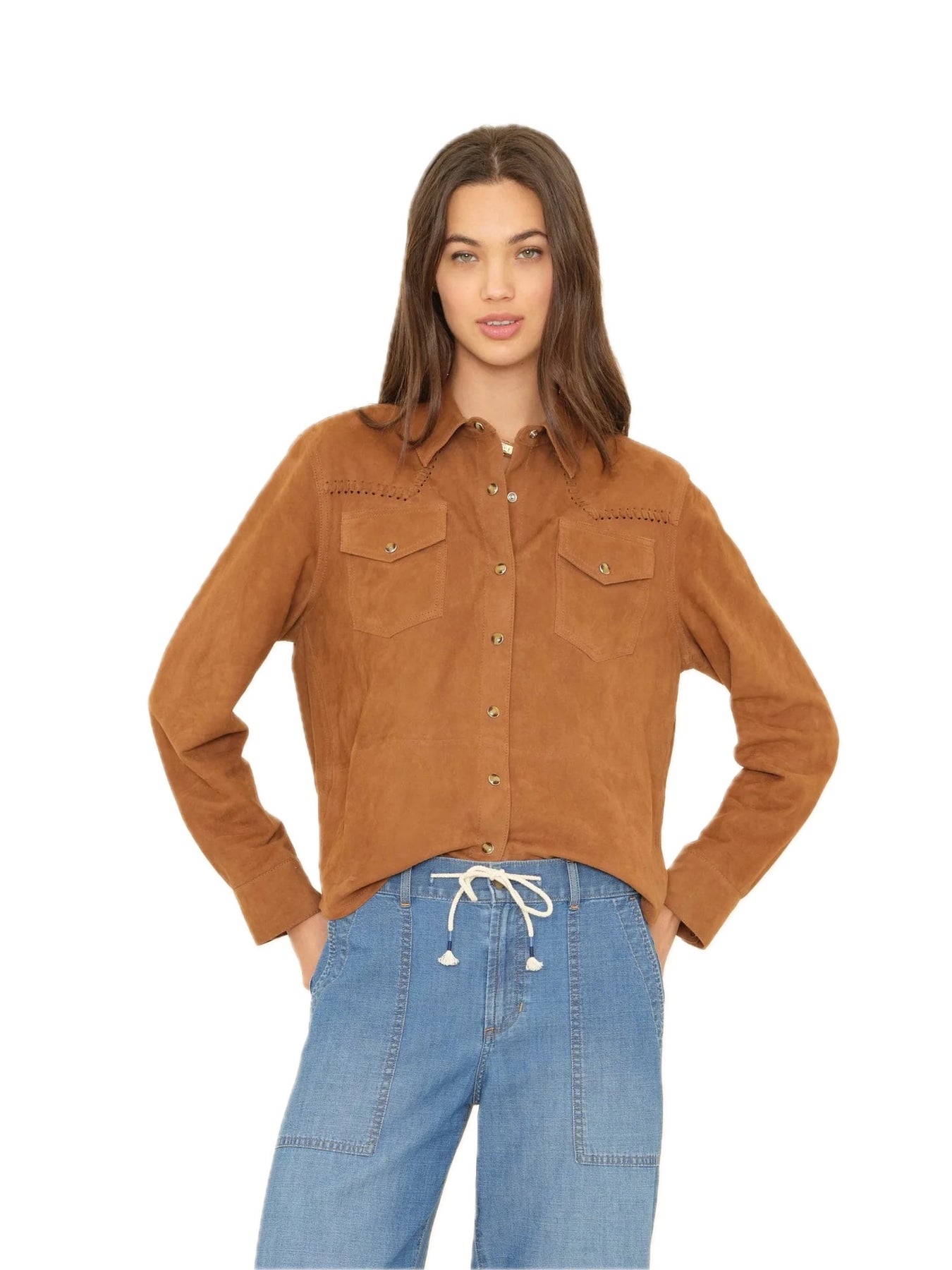 Saddle Up. Billie is new this season in a soft and supple goat suede. This Western-inspired button-front shirt features pearlized snap buttons, two front patch pockets, and whipstitch details throughout the front and back.