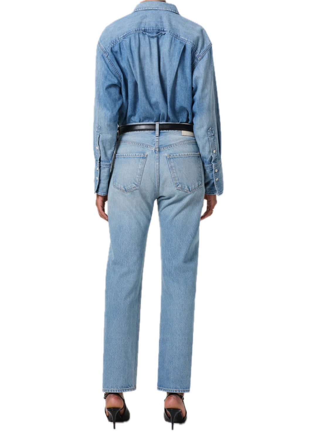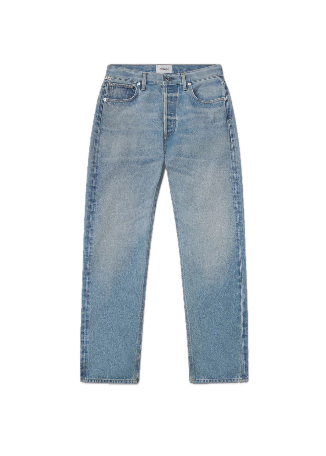 The ‘Blaine’ is a high-rise, vintage-inspired straight leg designed with a clean ankle-length inseam. The ‘Gemini’ wash is a pale indigo with soft fading, marbling, and whiskering—offering a sun-washed, lived-in look. Crafted from rigid regenerative cotton with a soft hand, it’s a light-wash essential that pairs effortlessly with everything from oversized knits to simple tanks.