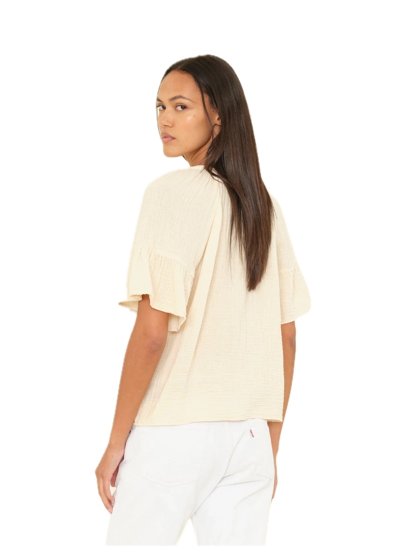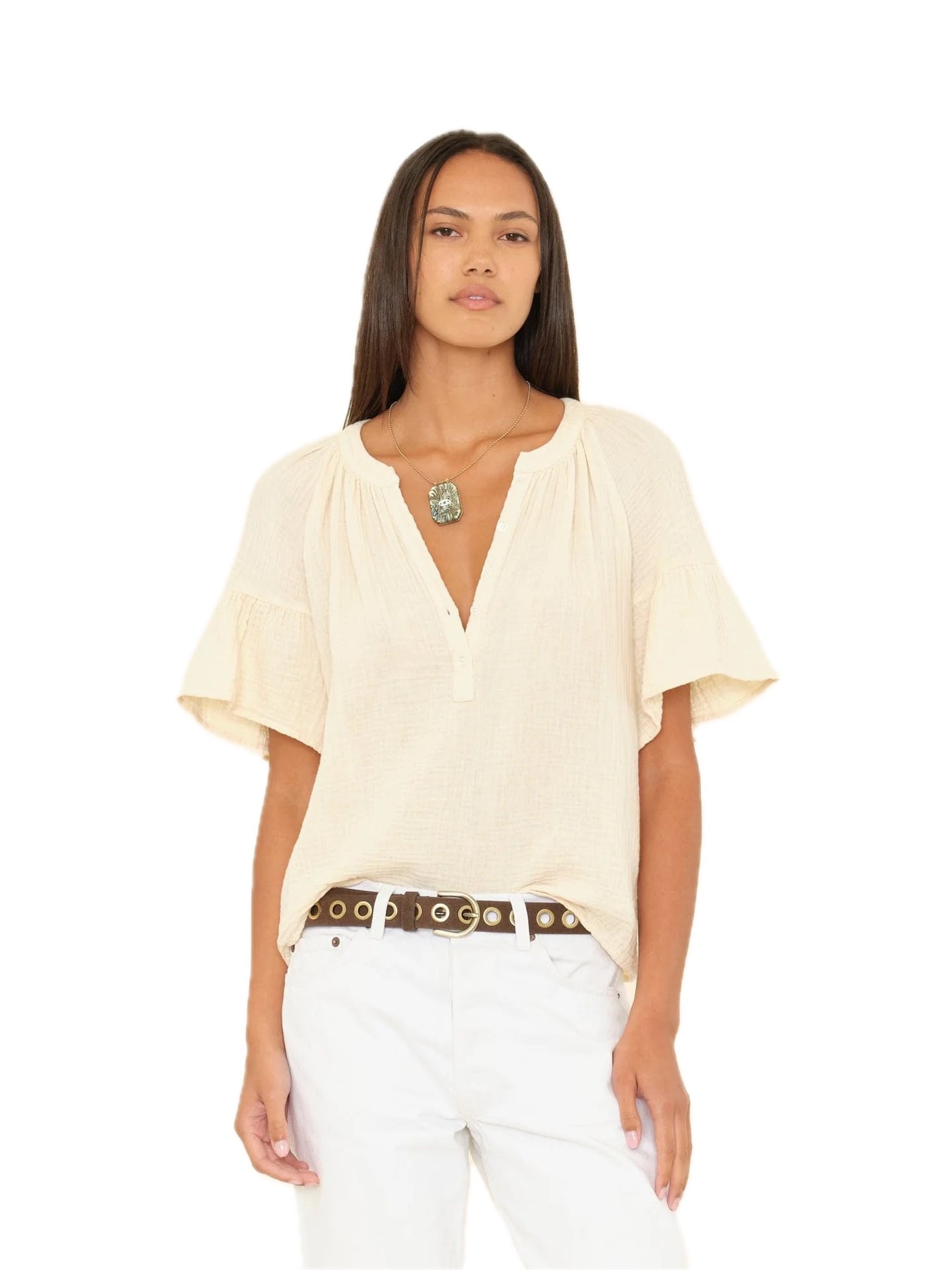 Nia is new this season in a washed double faced cotton gauze for a soft, gently crinkled feel. This femme popover top has a shirred split neck and flutter sleeves.