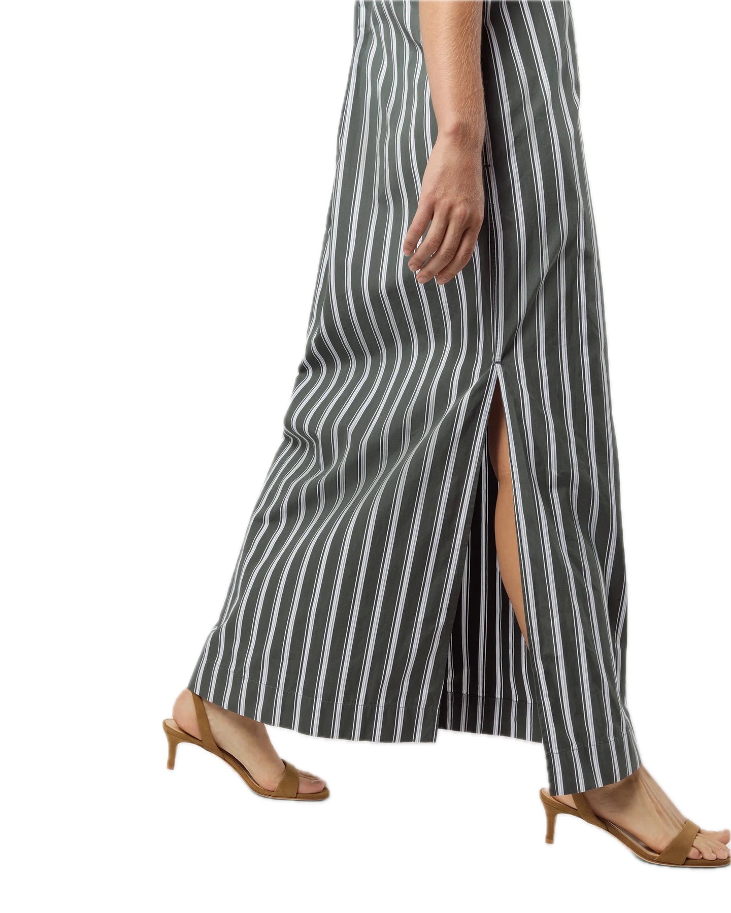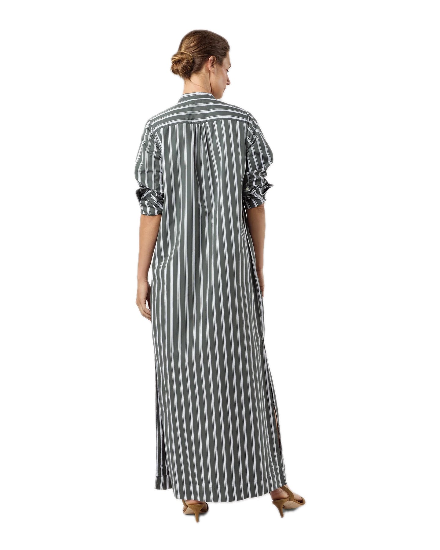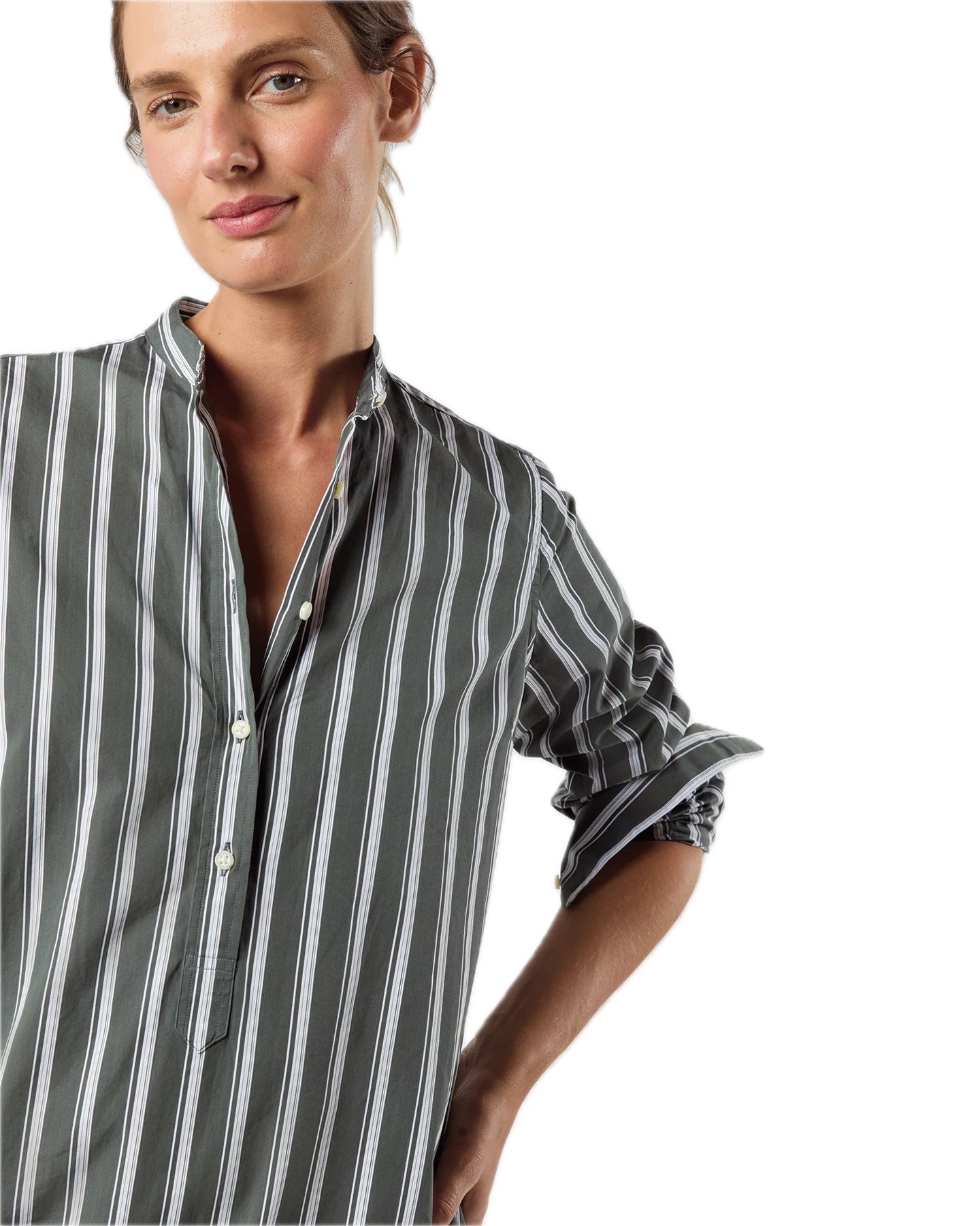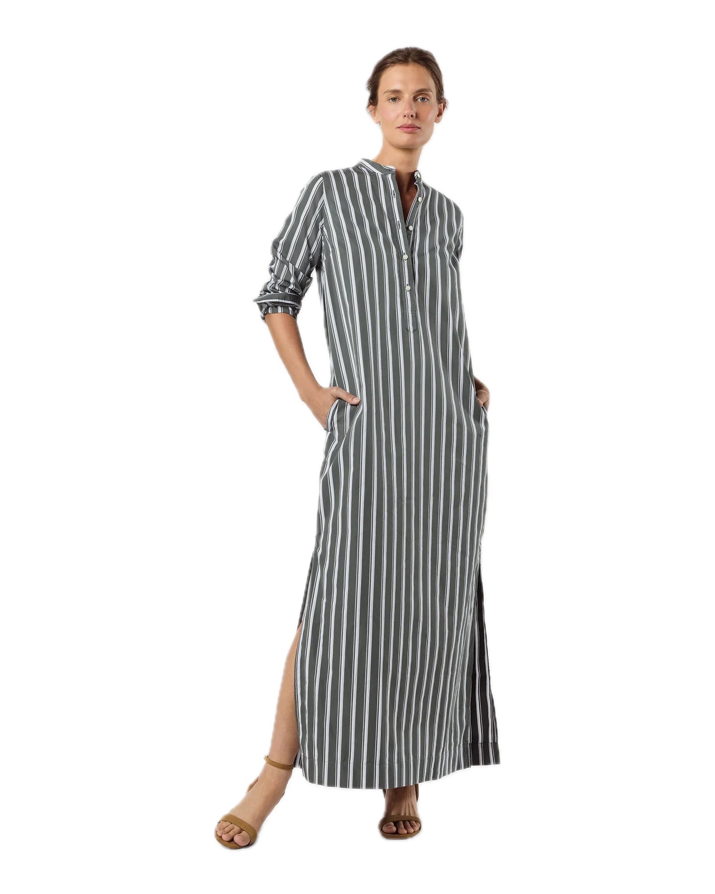 A slim, minimal, caftan-esque shirtdress made with all the same details as Ann Mashburn's shirting, a favorite light, crisp Italian poplin. This stripe will take you into fall nicely — swap your flat sandal for a kitten heel and drape a sweater over your shoulders, and you're there.