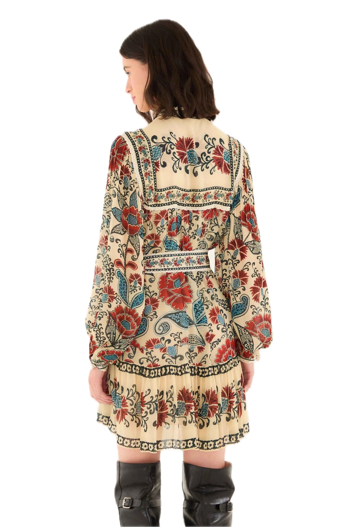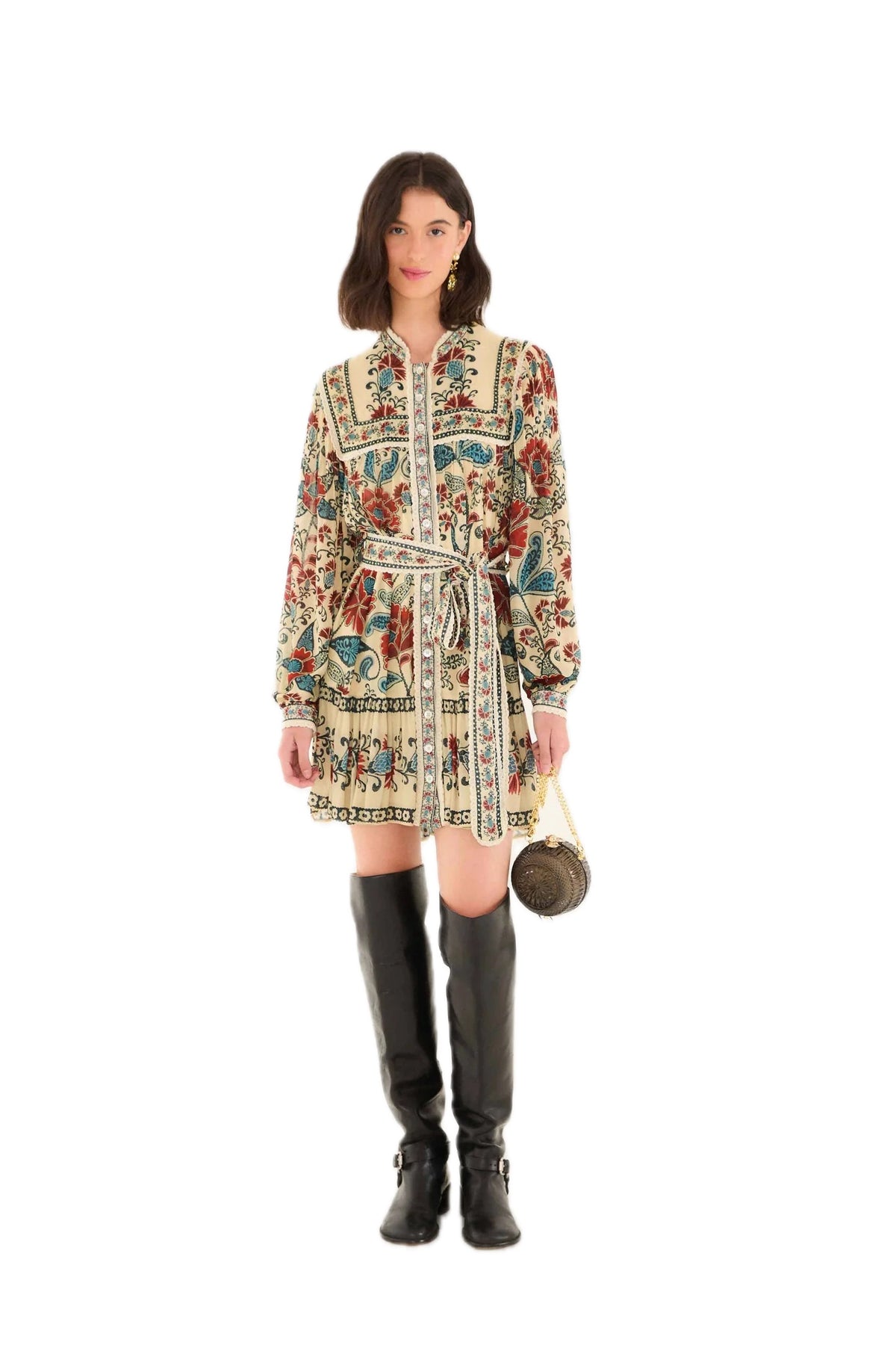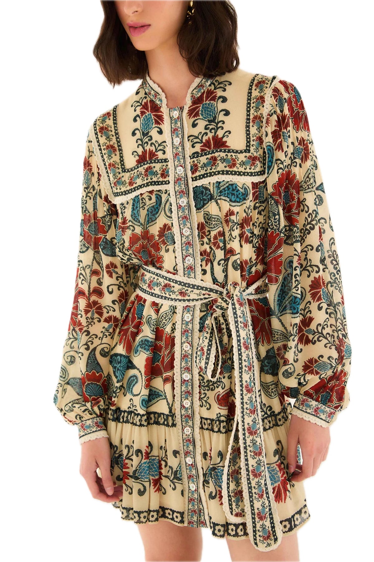The Sand Francesca Long Sleeve Mini Dress weaves warmth and charm into its sand-hued canvas, adorned with a vibrant, intricate floral pattern in lush reds and calming blues. The playful silhouette flows freely from a delicate round neckline, enhanced by subtle gatherings below the yoke and along the skirt. Softly puffed sleeves and a matching belt add gentle definition, making this dress a radiant embrace of comfort and joyful elegance.