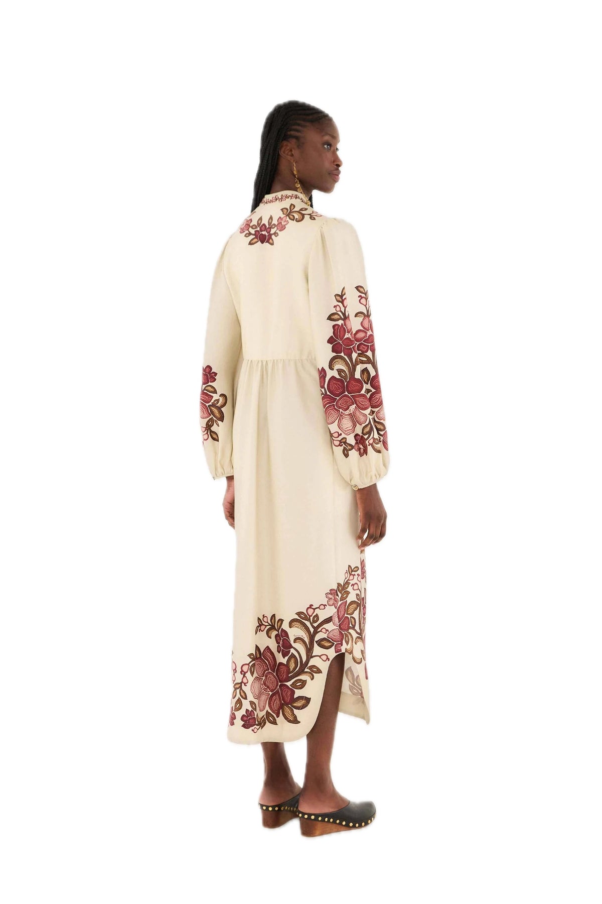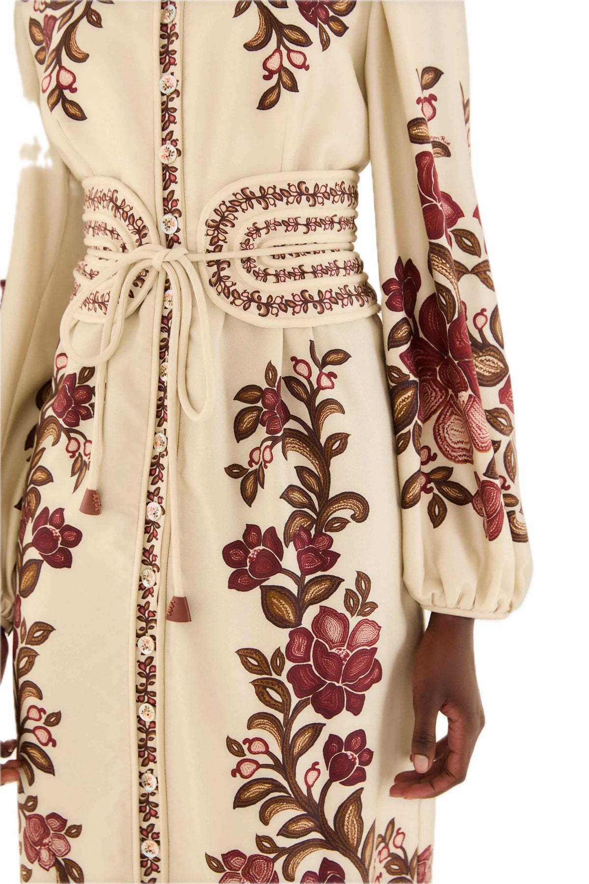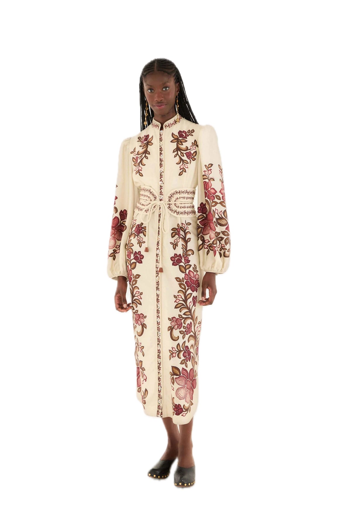 Embrace a graceful flow with the Sand Renata Floral Long Sleeve Midi Dress, featuring a high neckline that enhances its delicate silhouette. This dress blooms with intricate floral patterns in warm rose, burgundy, and earthy tones, layered in a fluid midi shape. The puffed long sleeves bring softness and a touch of whimsy, while the embroidered waist belt cinches gently to create an inviting, feminine embrace.