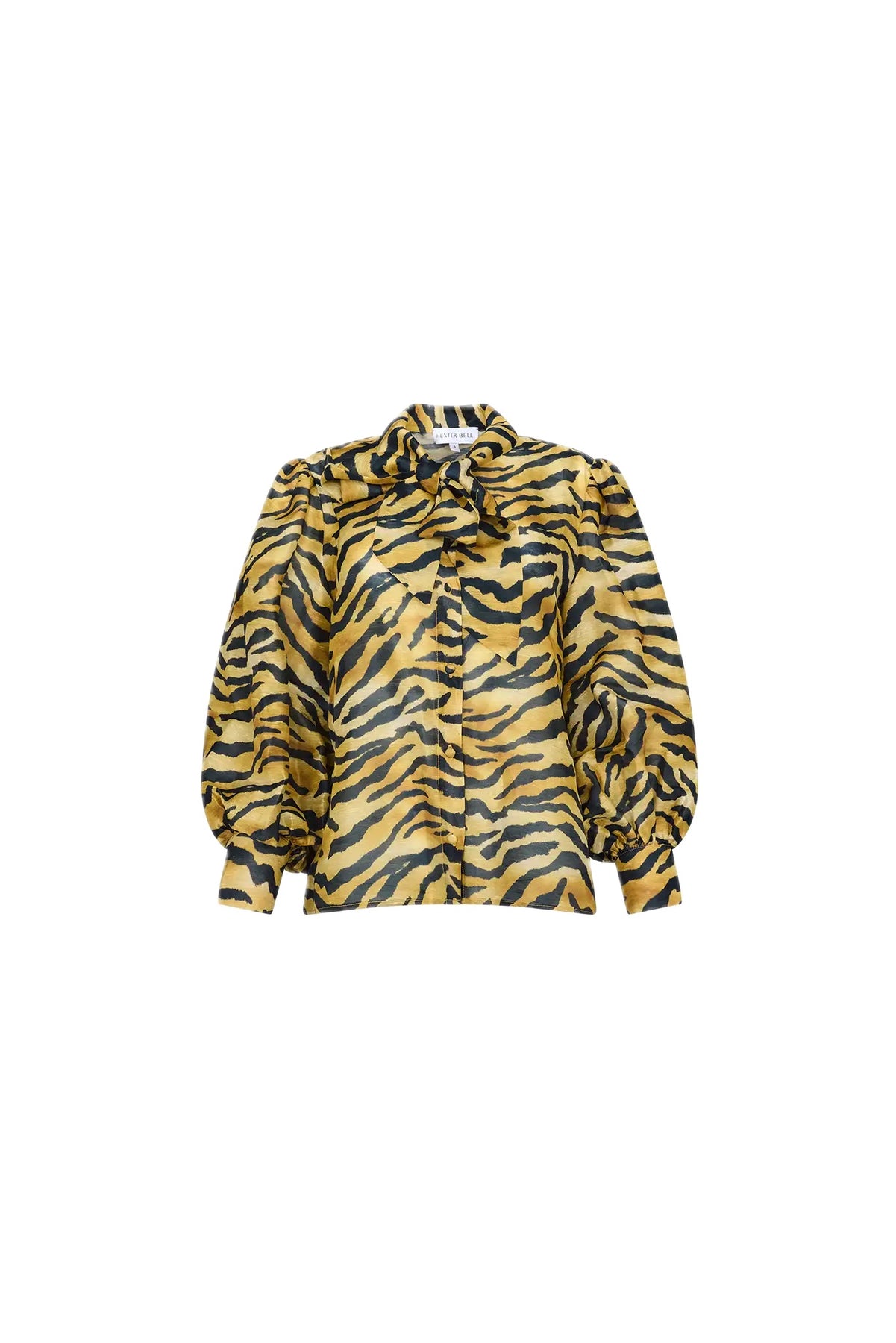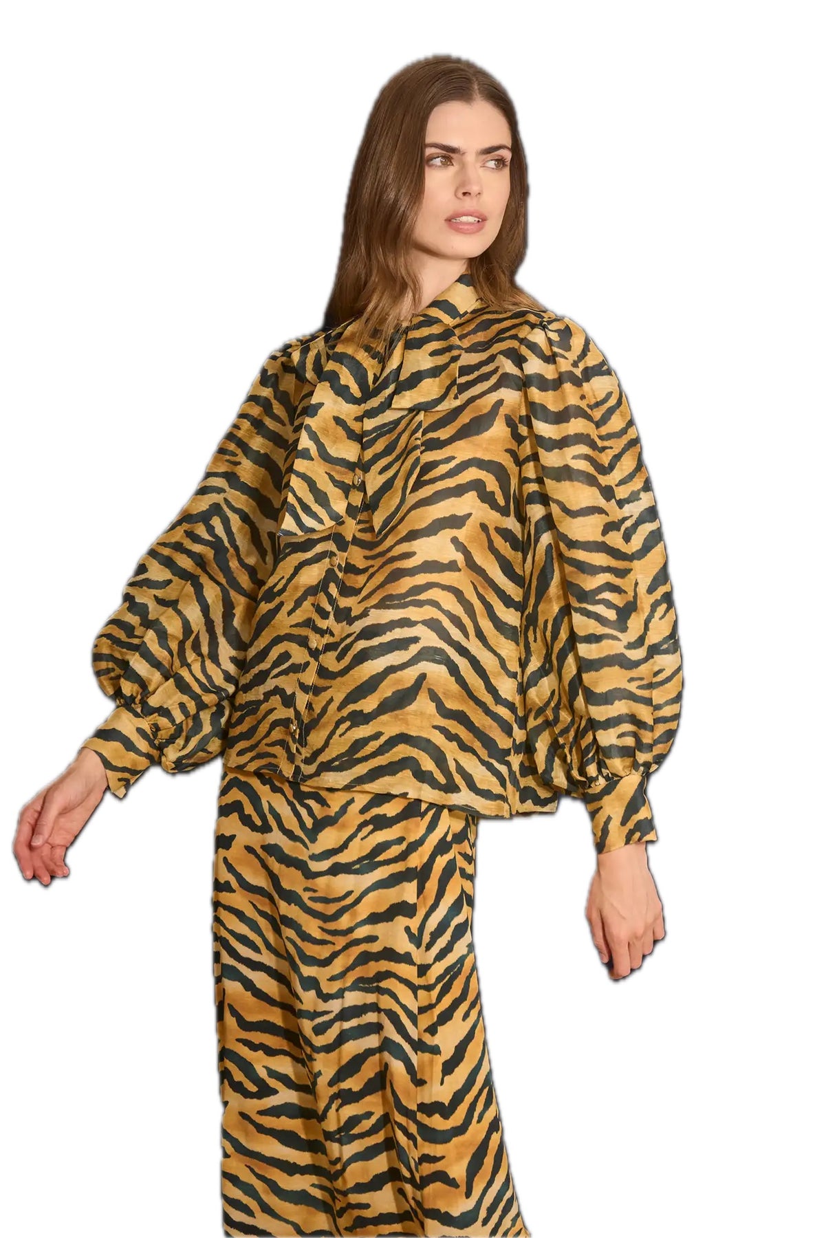 Make a statement with the Tess Blouse in linen silk Tiger print, a defining piece of the season. Featuring an elegant tie-front neckline that can be artfully styled into a bow, along with delicate shirring at both the front and back bodice, this blouse transcends the ordinary. Its sophisticated design ensures it stands out as a refined and memorable addition to your wardrobe.