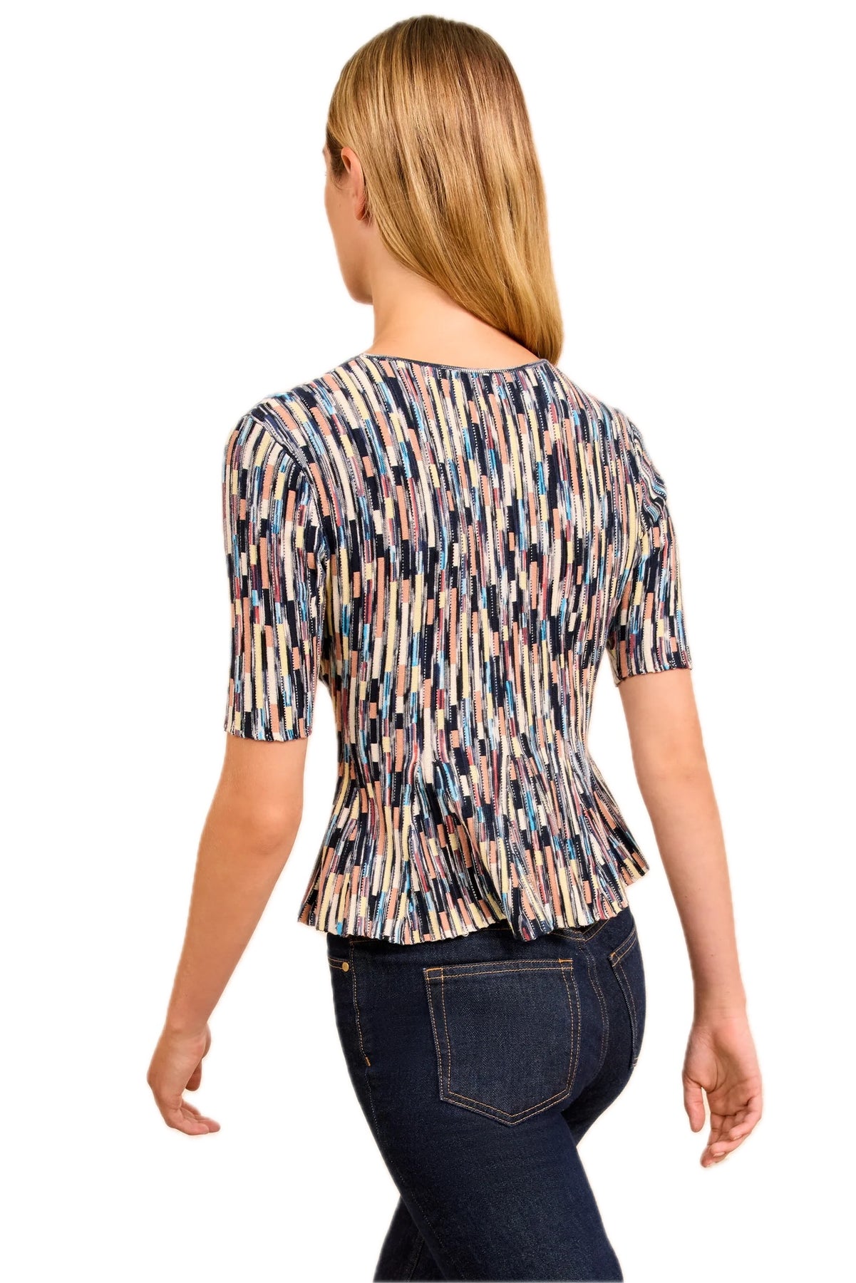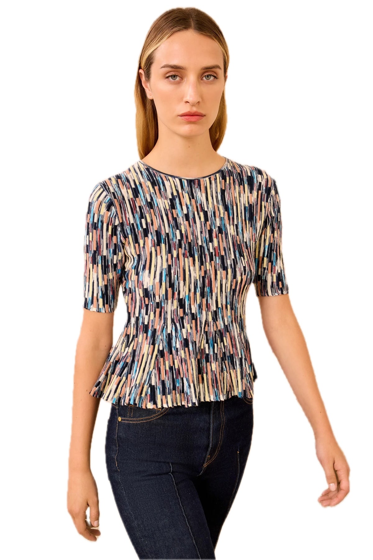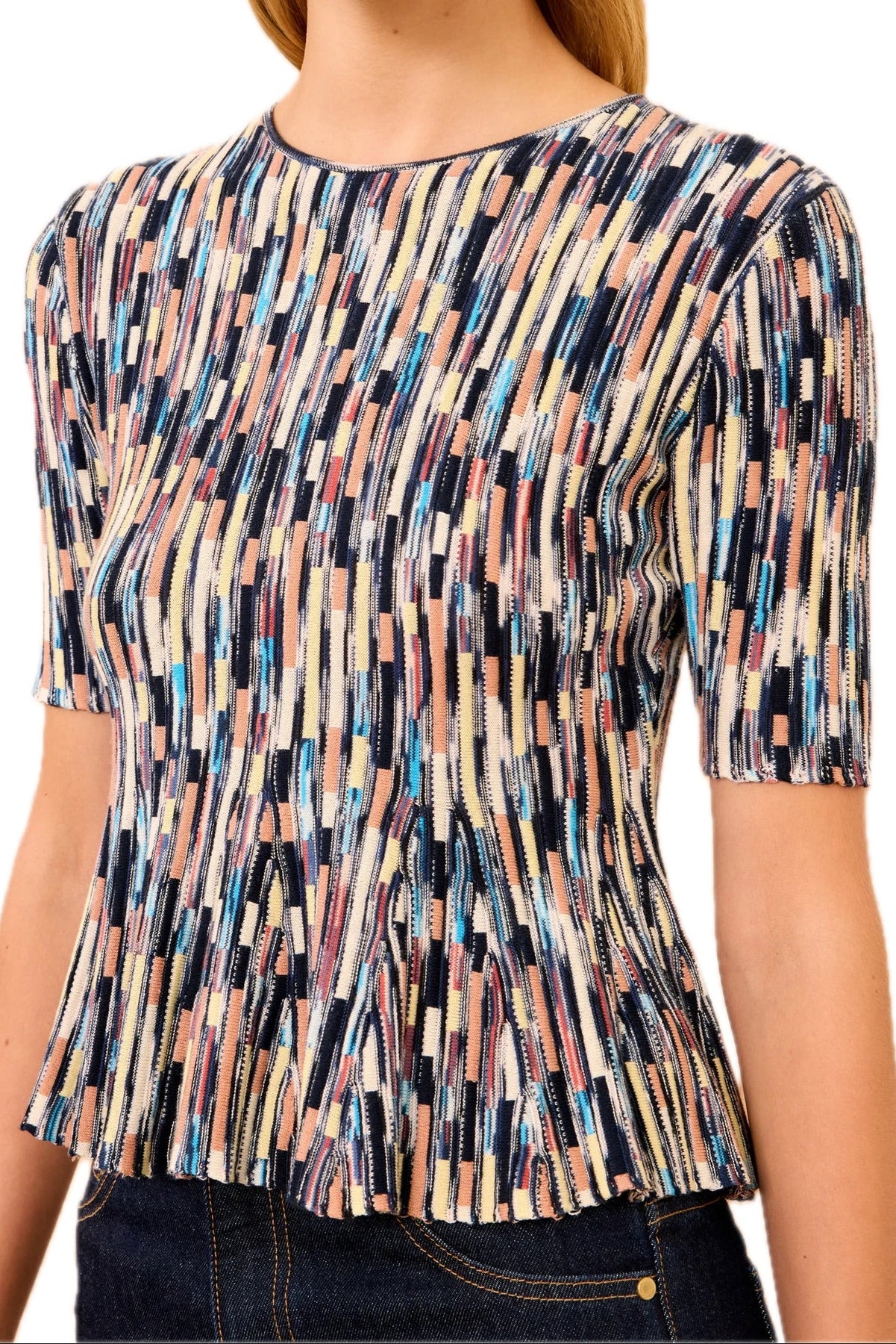 The Samira Pullover features solid and spaced-dyed yarns knitted into a vibrant palette of psychadelic stripes. This multiclored knit has a slim fit that transforms into a subtle peplum hem.