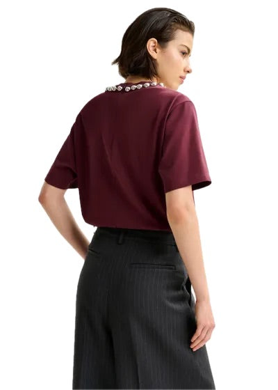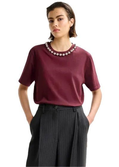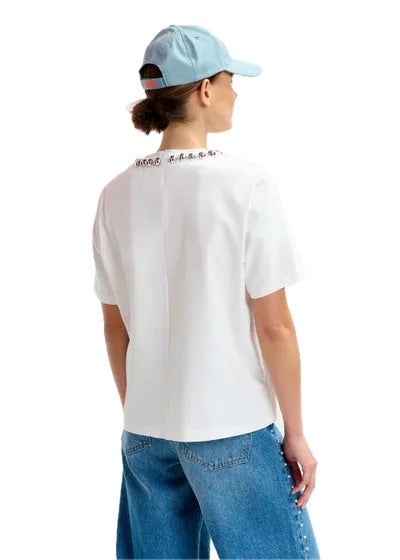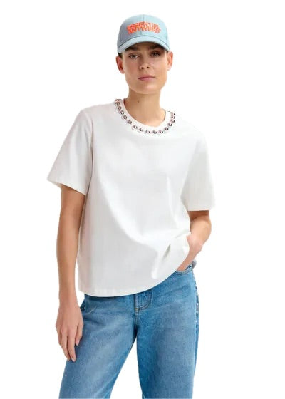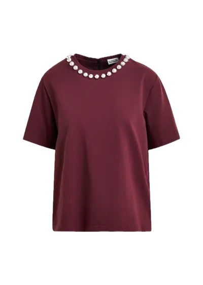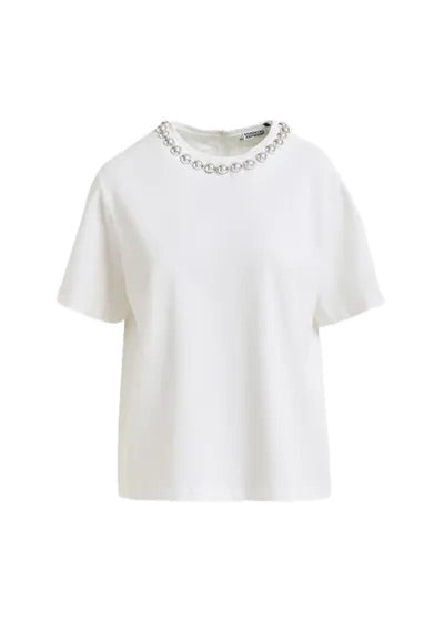 Cotton T-shirt is cut for a boxy, relaxed silhouette, it features short sleeves and a clean round neckline adorned with oversized metallic pearl-style embellishments for an elevated twist. A concealed zip at the back adds a polished finish. Wear it tucked into tailored pants or let it elevate your go-to denim.
