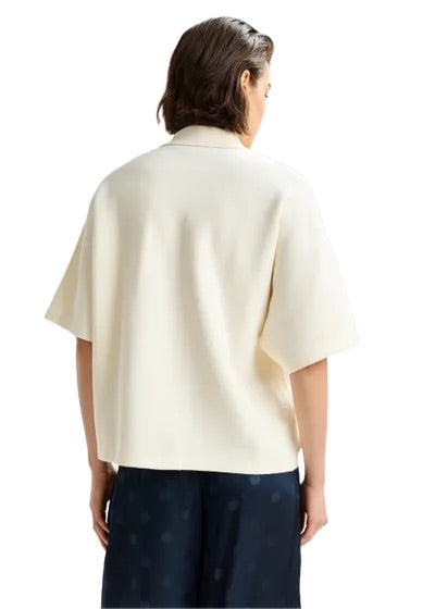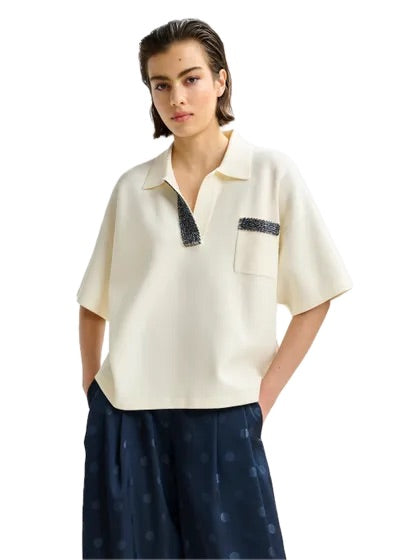 Finely knitted top is designed with a chic polo-style collar in a contrasting color, adding a touch of elegance. It features a relaxed fit and a chest pocket. The collar is adorned with delicate beaded embellishments.