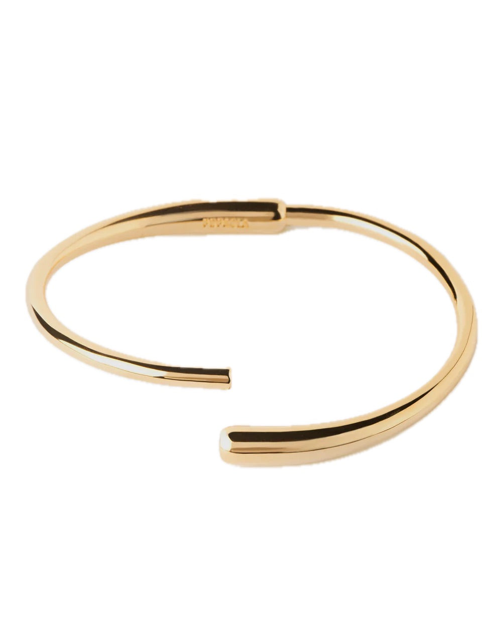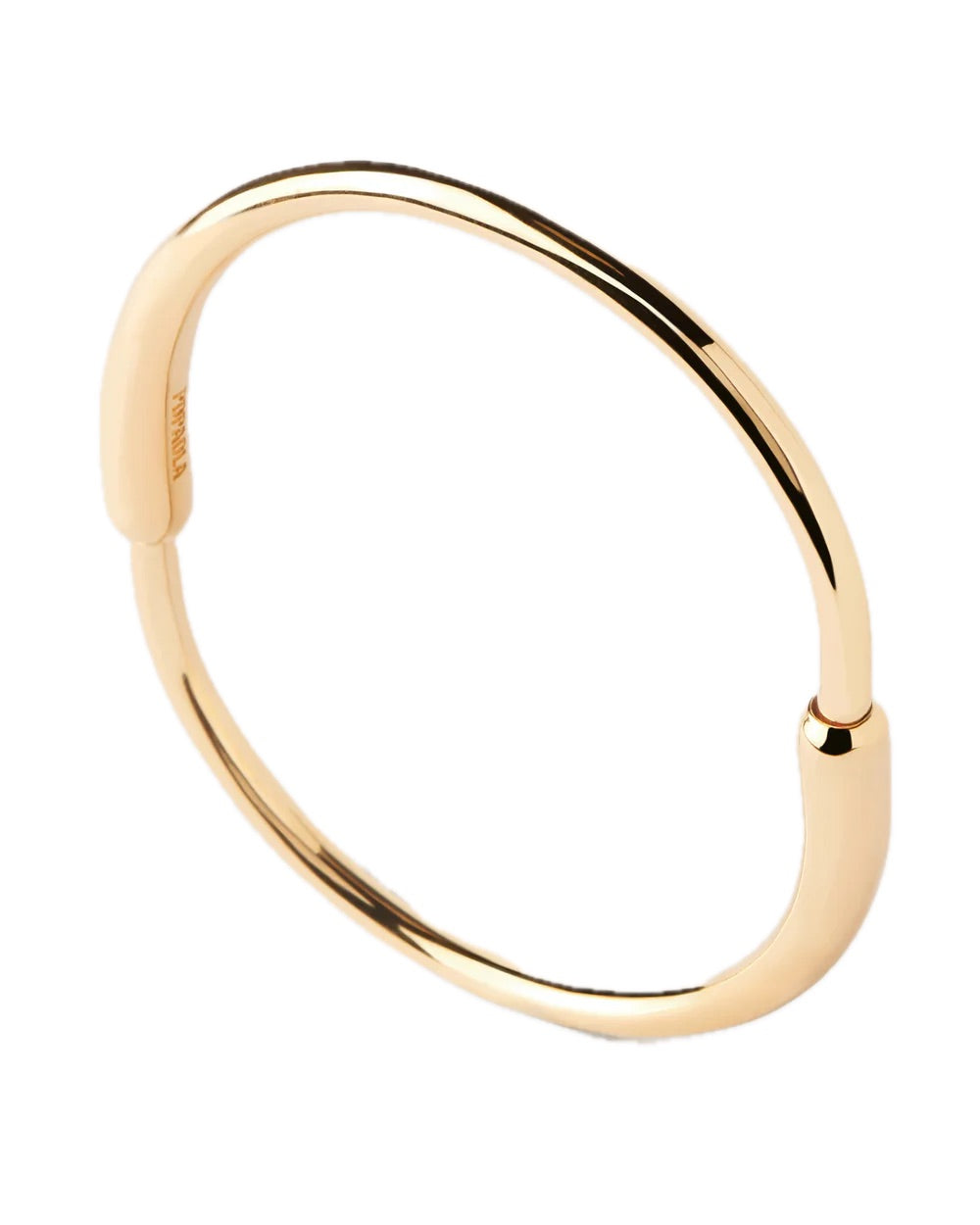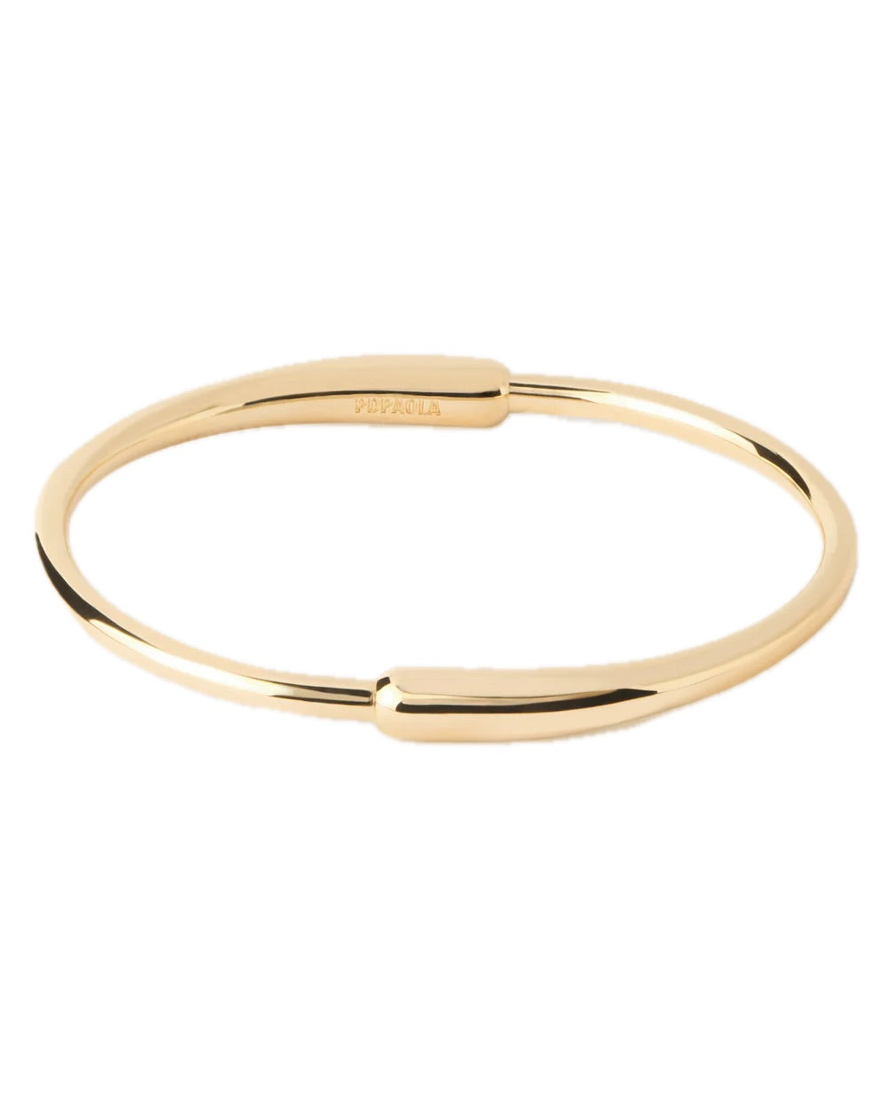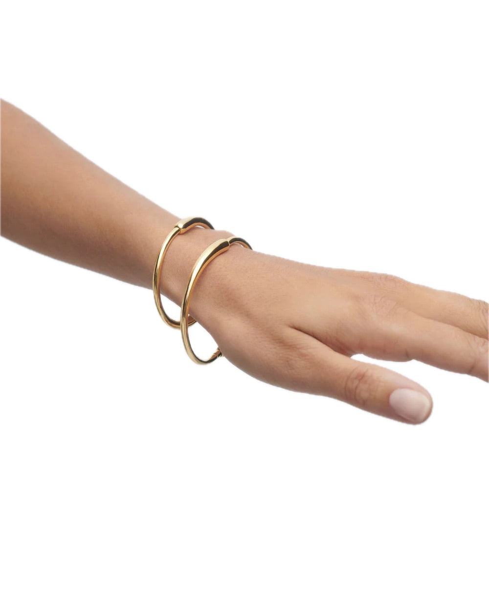 Modern bangle with asymmetric design featuring two elongated drop-shaped motifs.