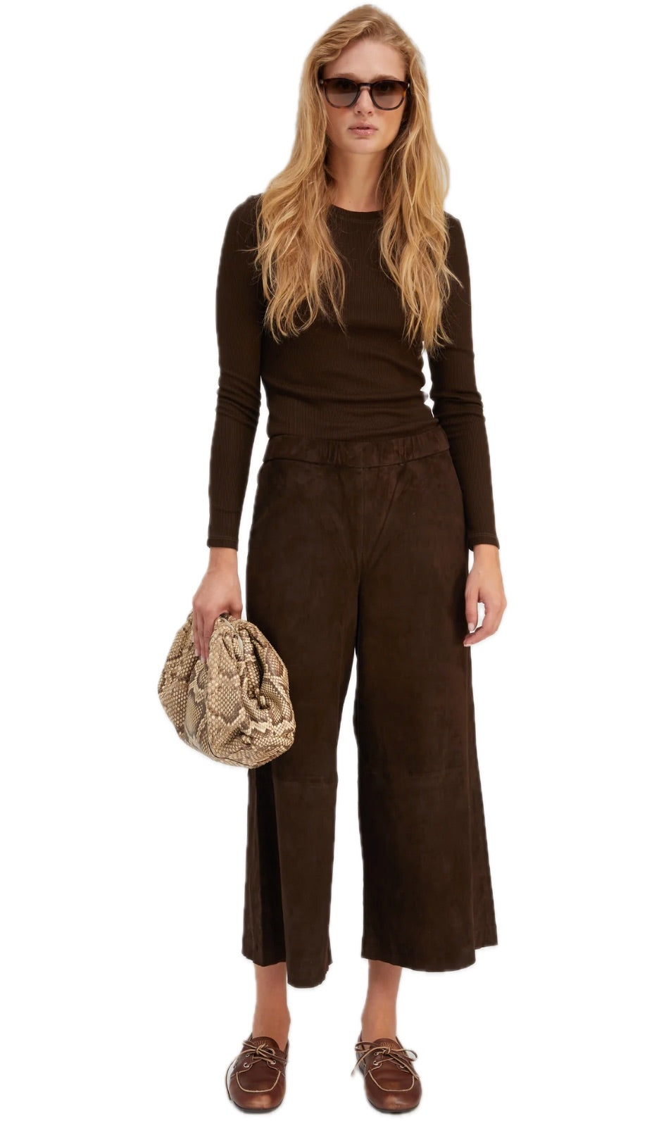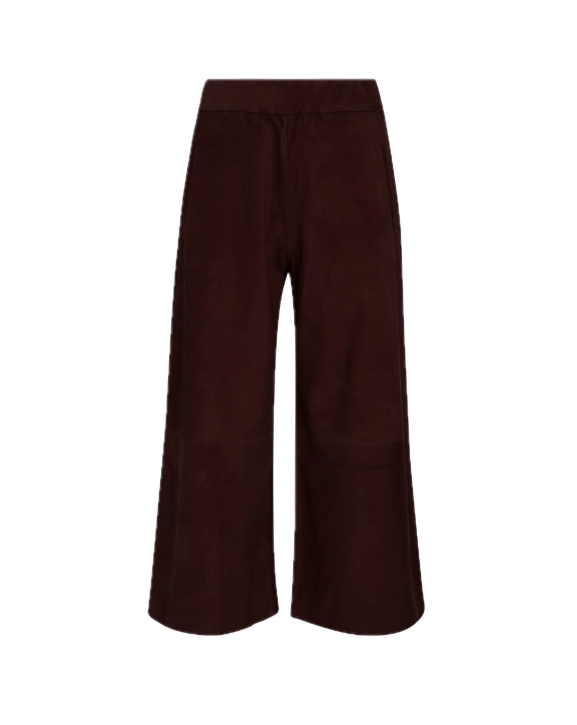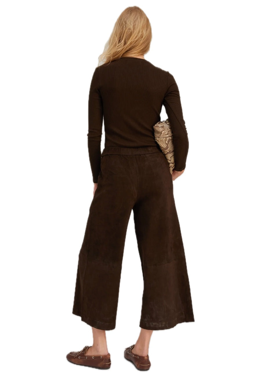 A classic high-rise wide leg pant, artfully cropped and designed with an easy pull-on fit. Made in a signature plonge suede leather, these culottes are buttery-soft to touch and extremely lightweight, while maintaining a structured and luxurious look. These pants are tailored with pintucks down the front and back for a lengthening look.