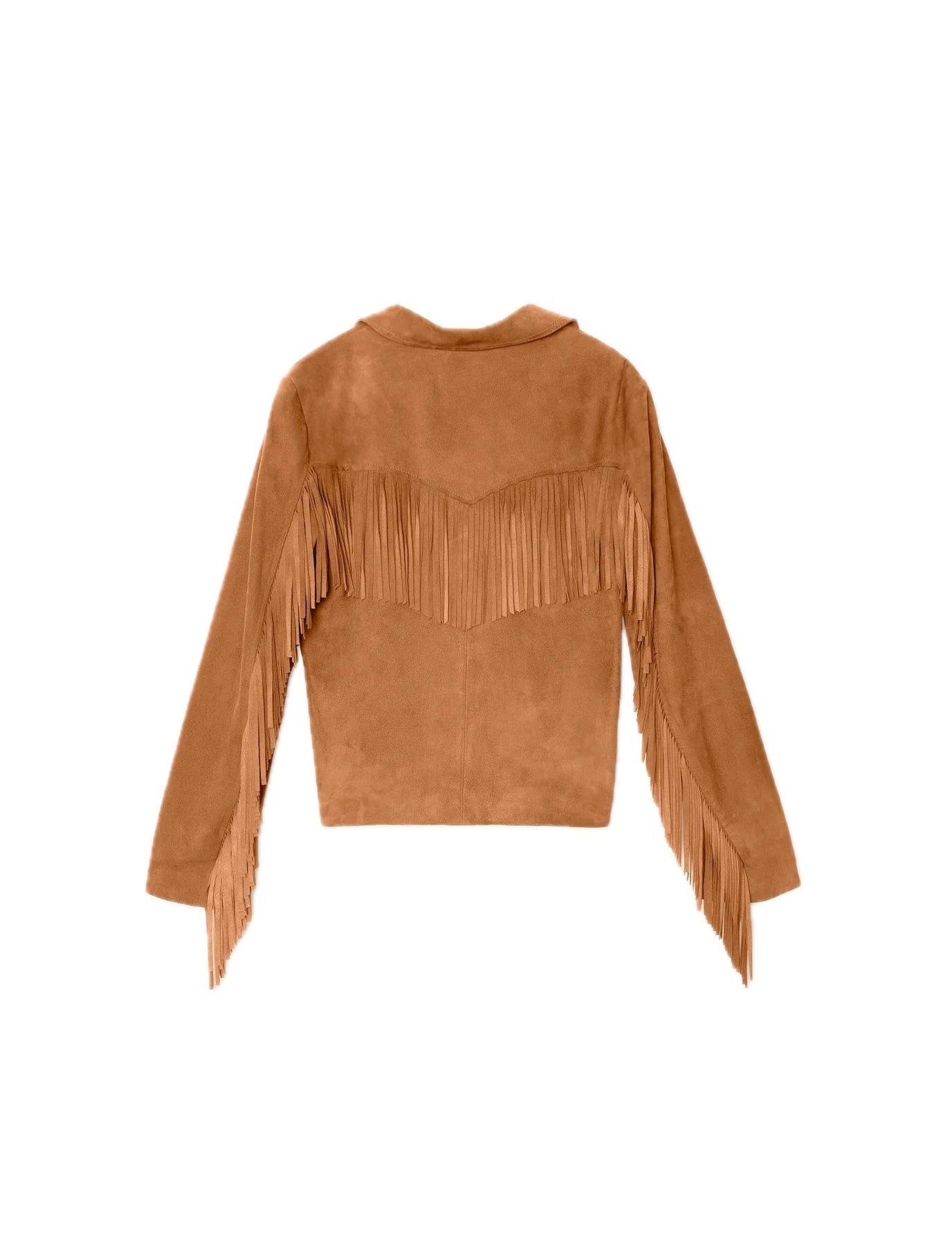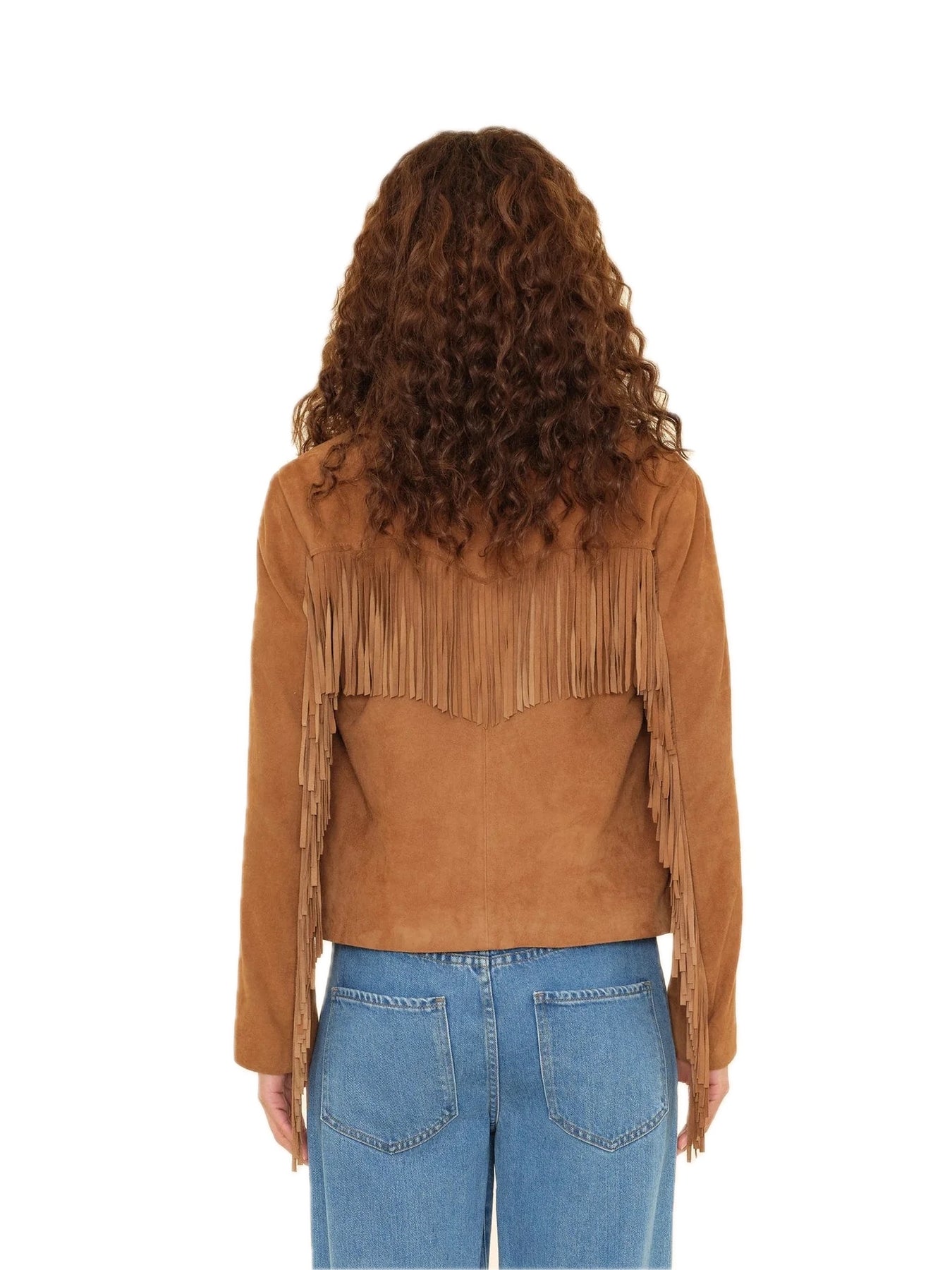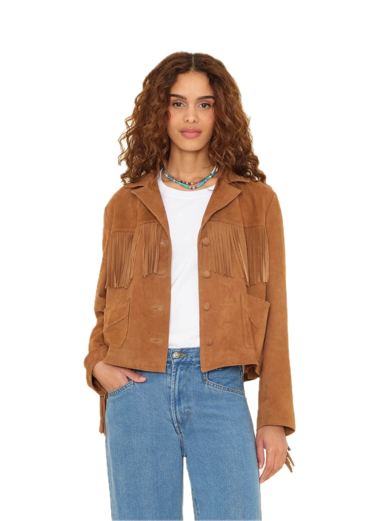 Saddle Up. Bronco is new this season in a soft and supple goat suede. This statement jacket is lined and features a Western yoke, suede fringe, two front flap pockets, and suede-covered buttons.