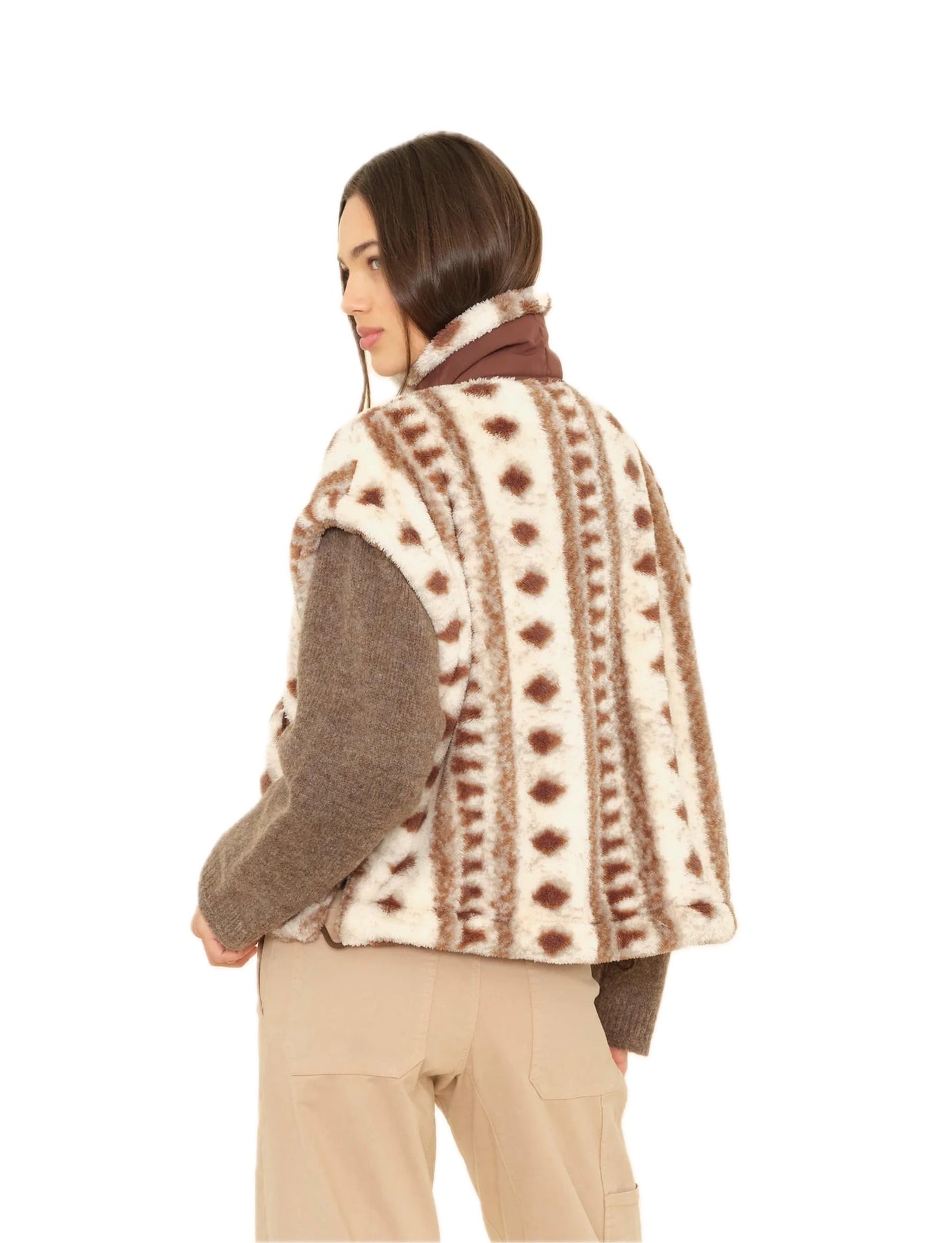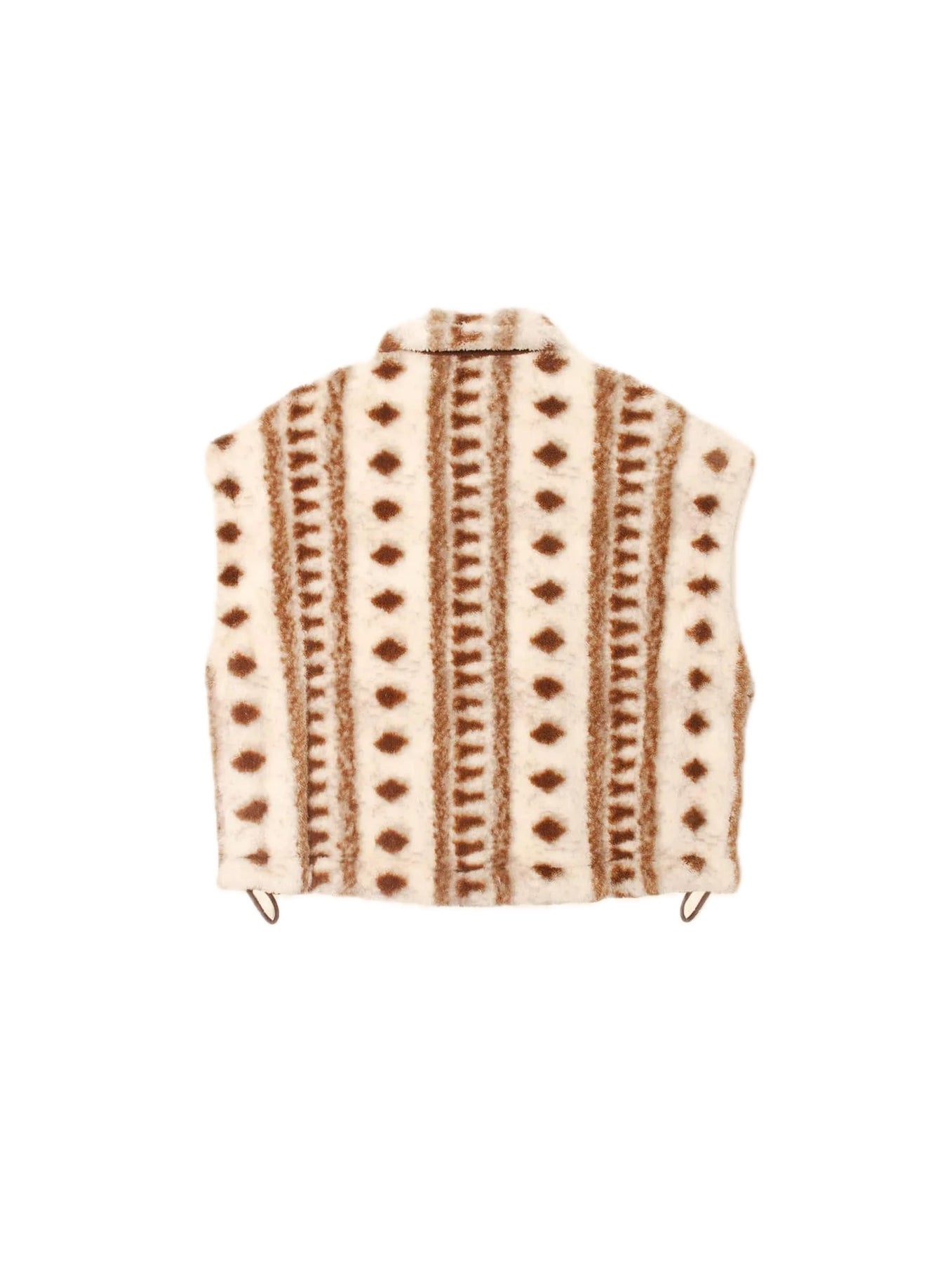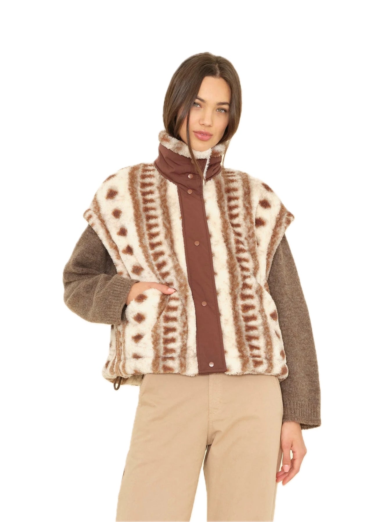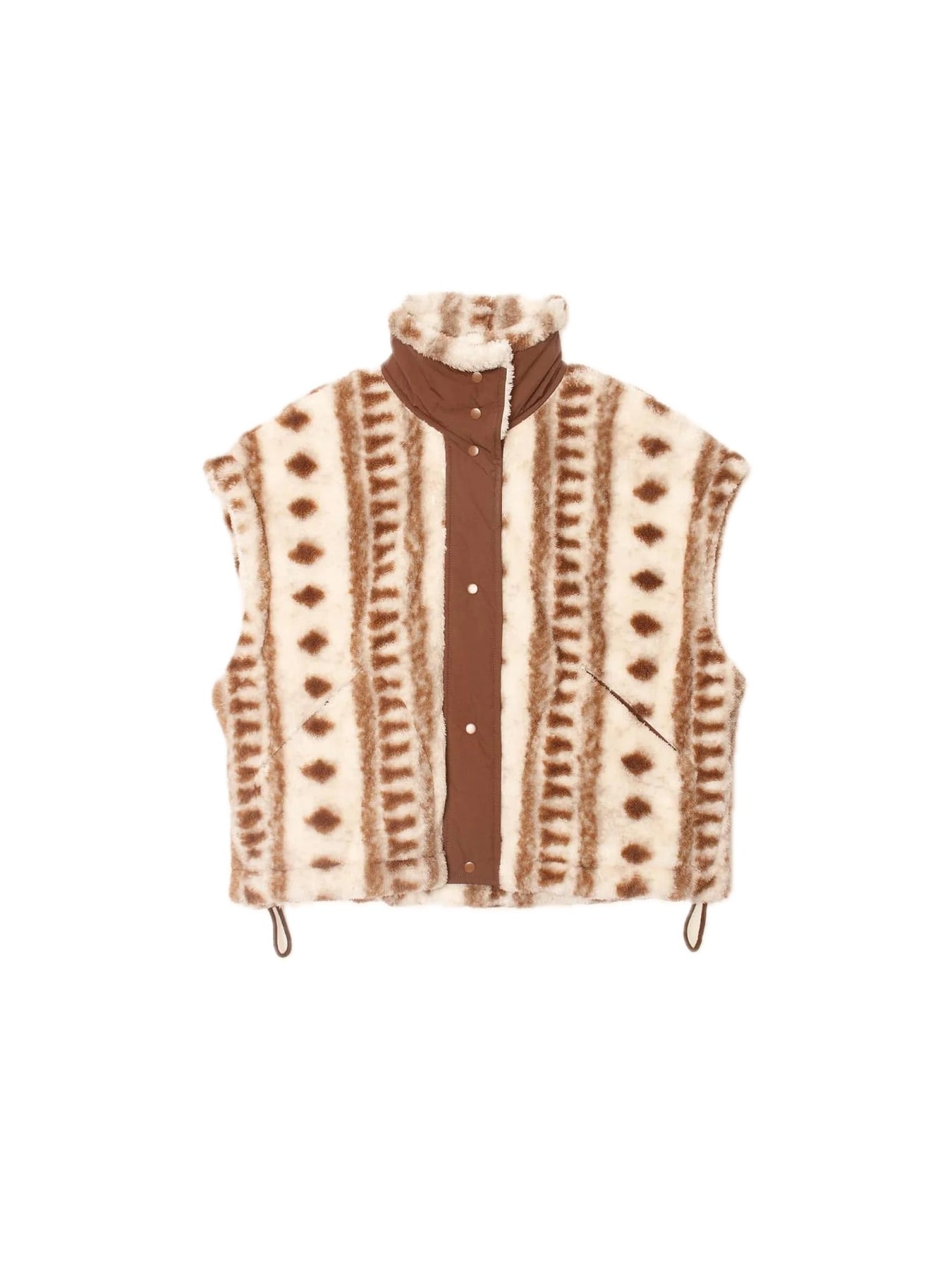 Make a (Cozy) Statement. Ravena is new this season in a vintage diamond print polar fleece. This oversized fleece vest features a contrast nylon button-front placket and funnel neck, patch pockets, and side vents with adjustable drawcords.