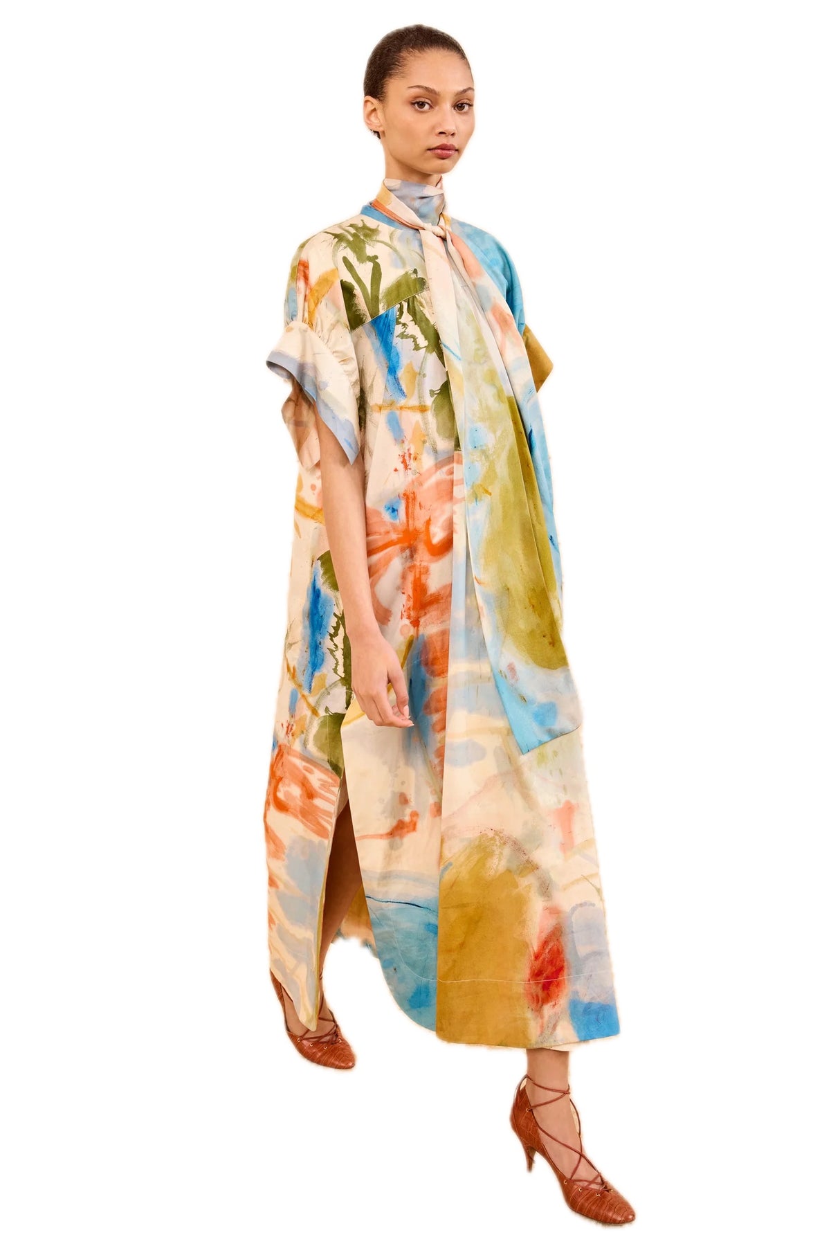 Showcased in Look 9 on the SS26 Runway, the Studio Dress is awash in lyrical, abstract imagery from Helen Frankenthaler’s 1957 painting "Western Dream.” This multicolored dress has an attached chiffon scarf that ties at the front or back, while the flyaway silhouette lends graceful volume.