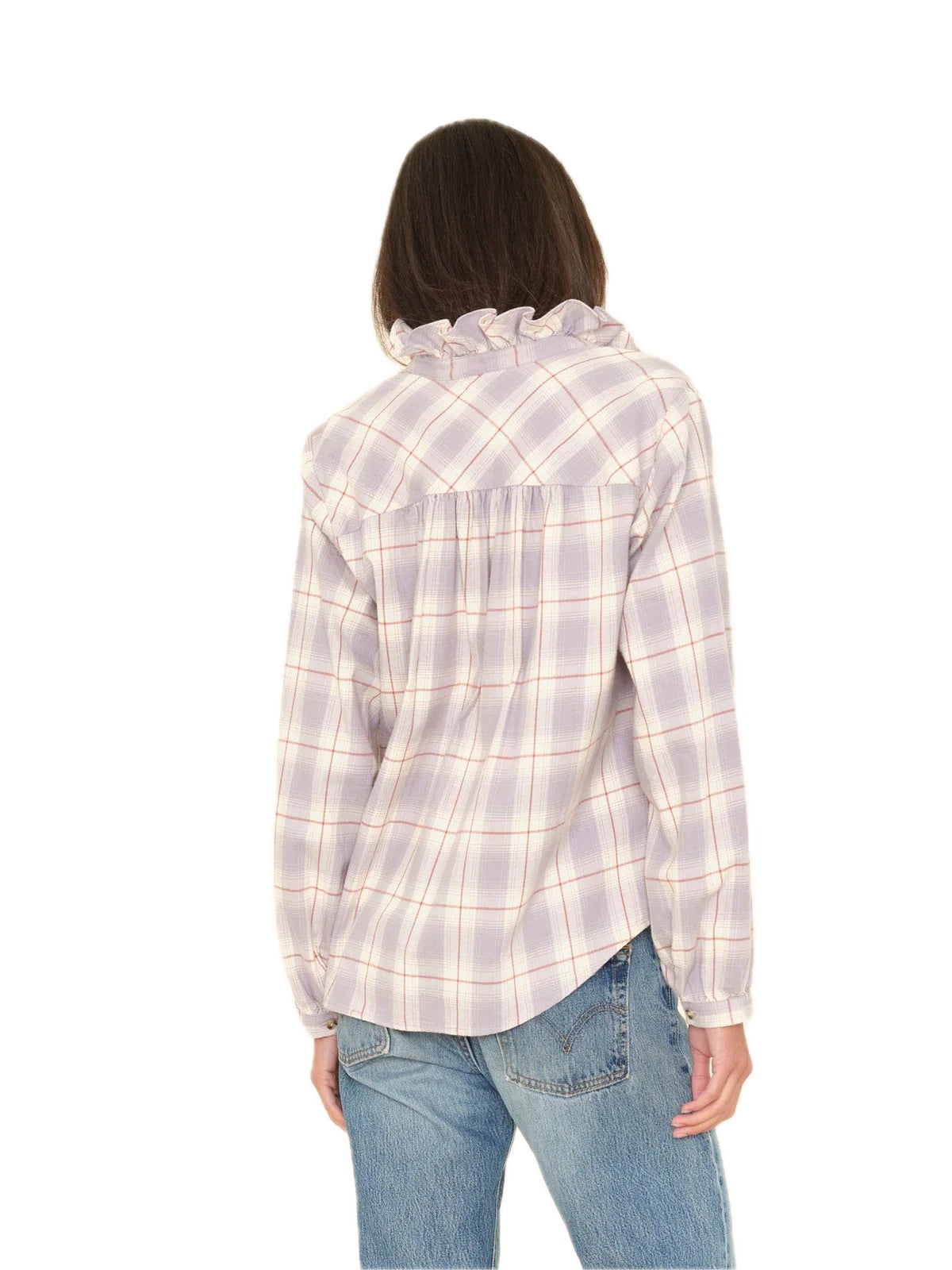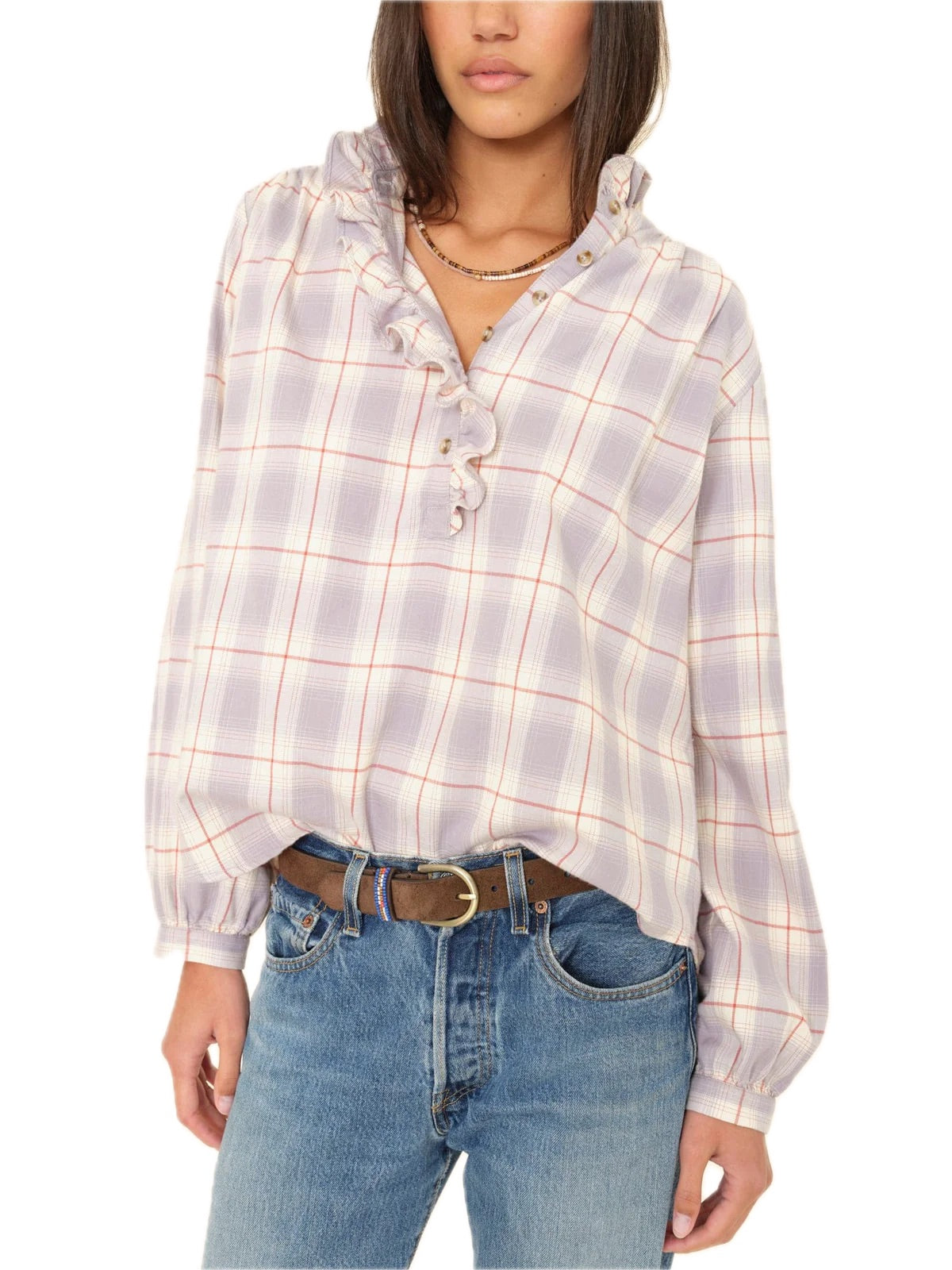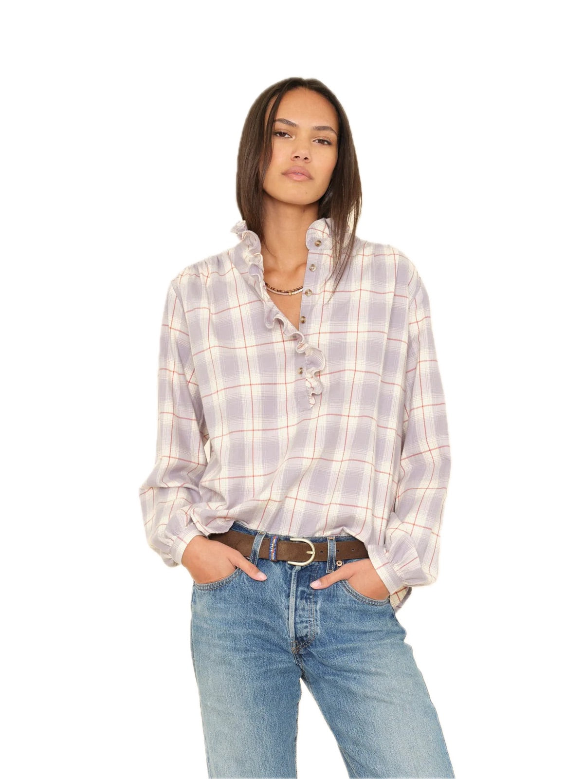 Pattern Play. Caspian is updated this season in a cotton flannel plaid. Caspian is a ruffle henley with ruffle details all throughout the neck and front placket. This elevated henley also has shirring at the sleeves, front, and back and a high low hem.